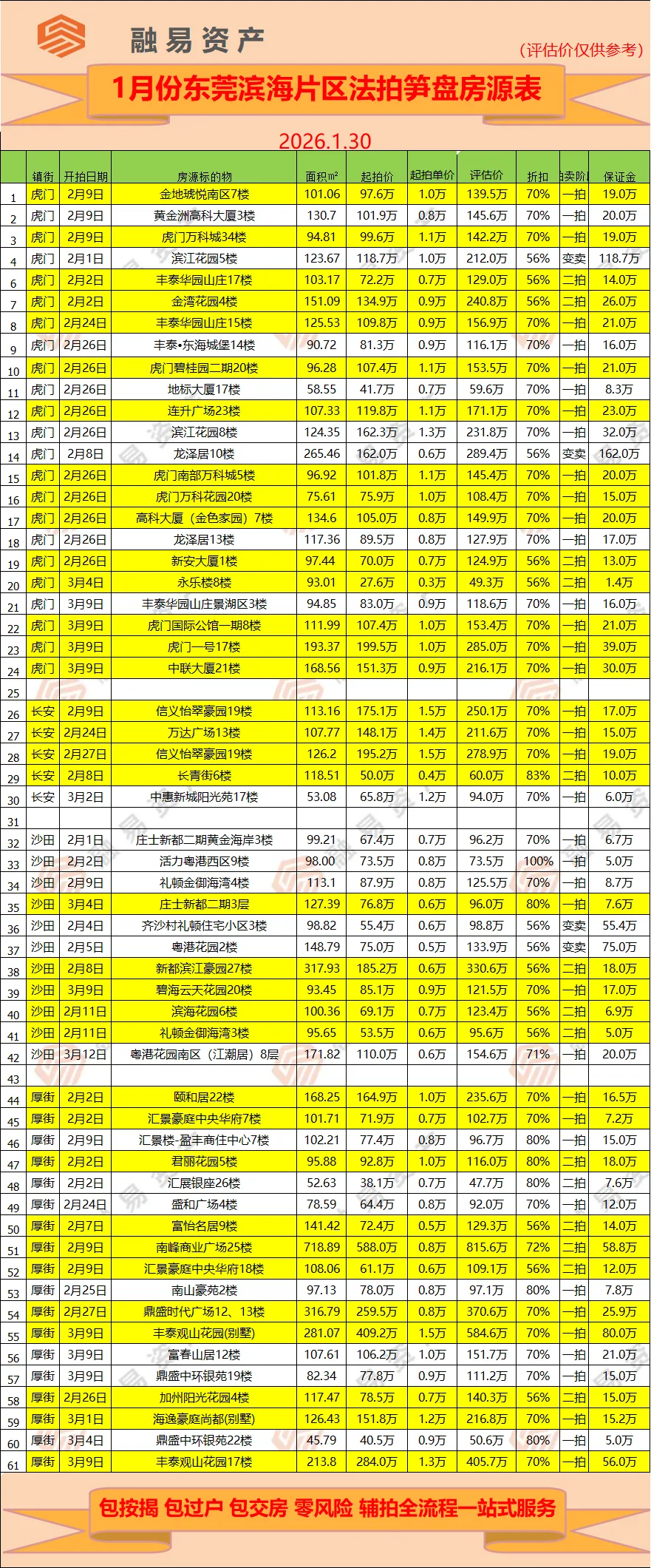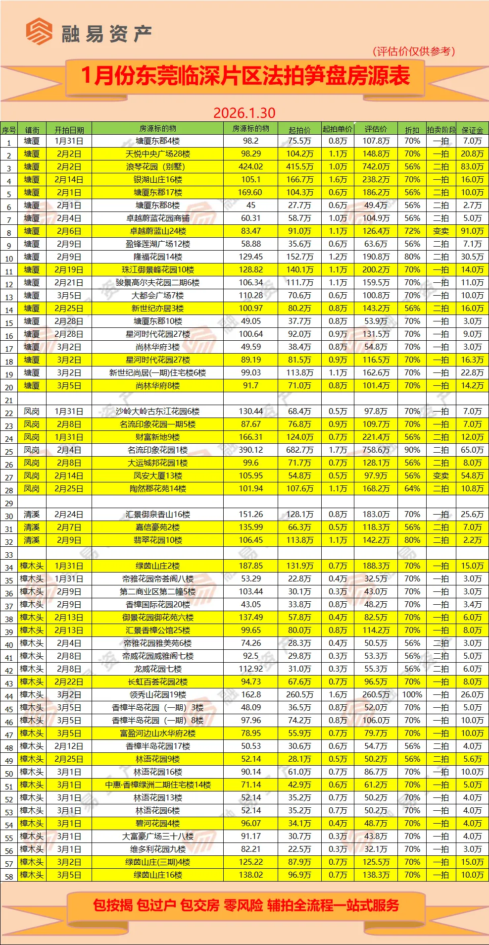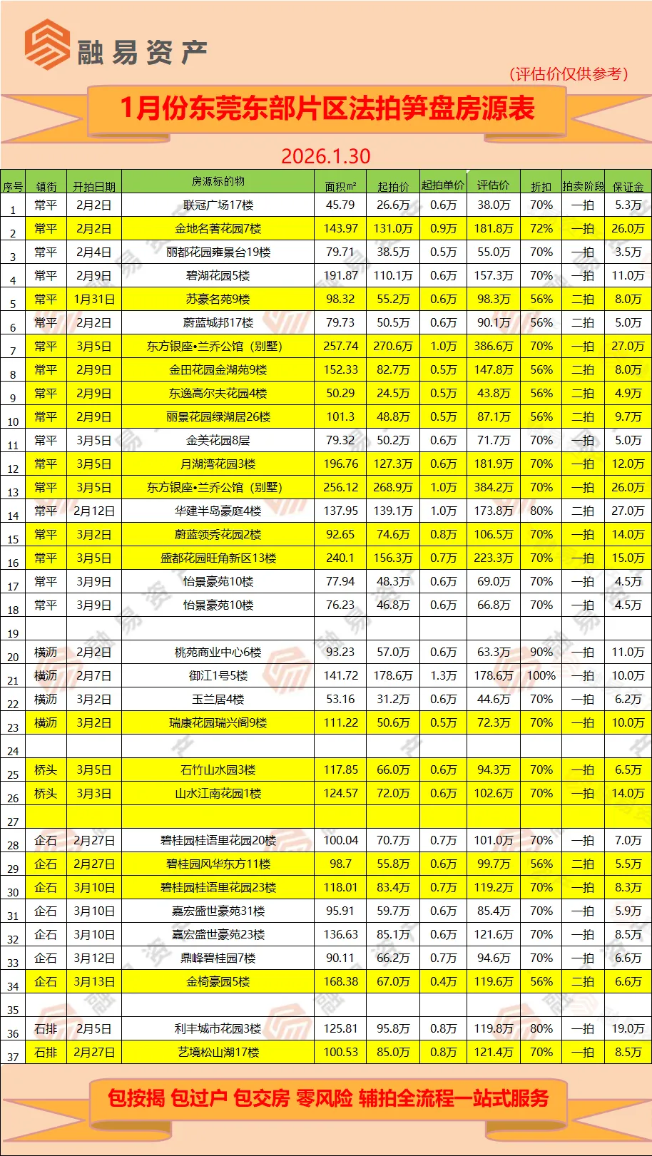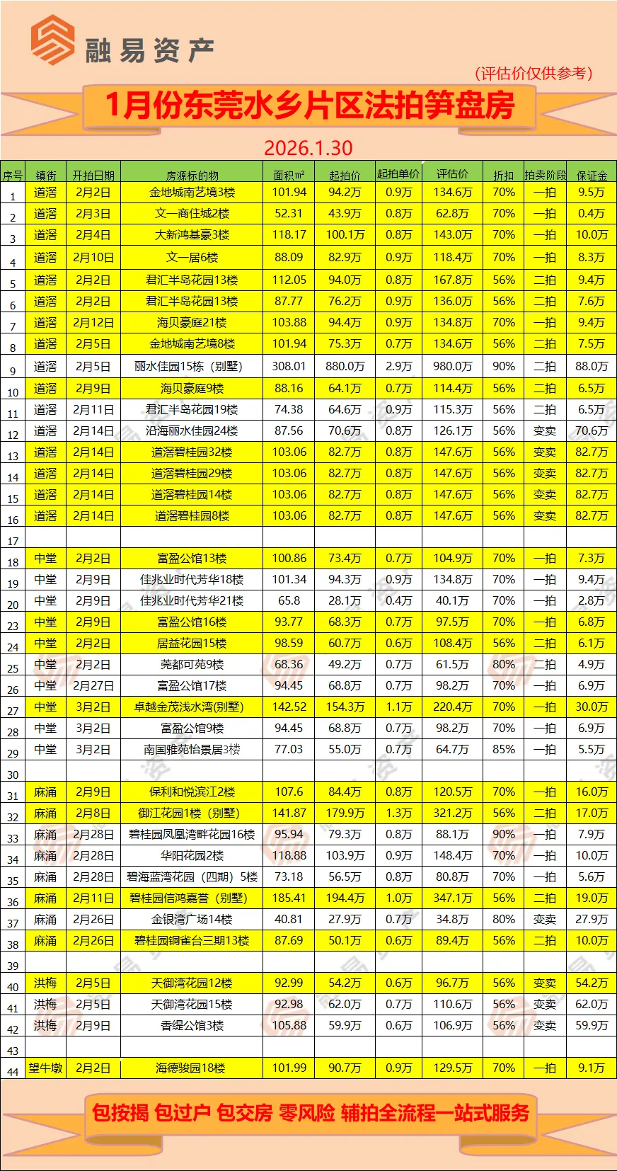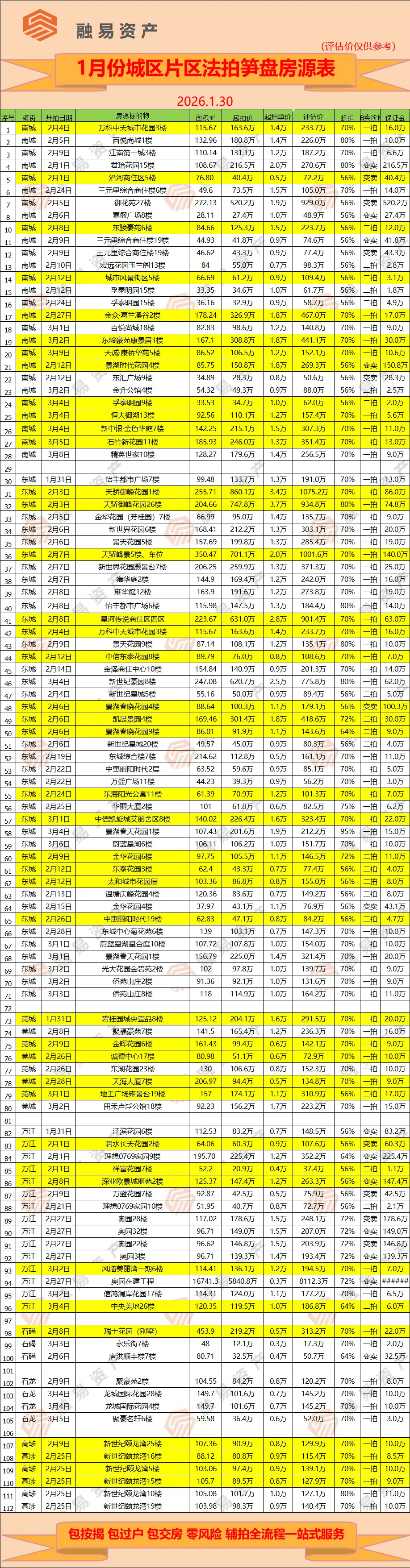 主城区,包括东城,南城,莞城,万江,石碣,石龙,高埗,共有4个城区,3个镇区,笋盘用黄色标记。滨海片区,包括虎门,沙田,厚街,长安,共4个镇区,笋盘用黄色标记。东部片区,常平为中心,周围一圈有企石,桥头,谢岗,石排,横沥。临深片区,包括塘厦,凤岗,清溪,樟木头4个镇区,这个片区靠近深圳中心区域,以前很多深圳人来买房,所以叫临深片区。松山湖片区,以松山湖为核心,周围包括有黄江,寮步,东坑,大朗,大岭山,茶山,共7个镇区,笋盘用黄色标注。水乡片区,包括道滘,麻涌,中堂,洪梅,望牛墩,共有5个镇区,这个片区经济较弱,楼盘比较少,所以房源不多。如果买法拍房,只需市场价8折,一套房随便就省几十万,并在此郑重承诺: