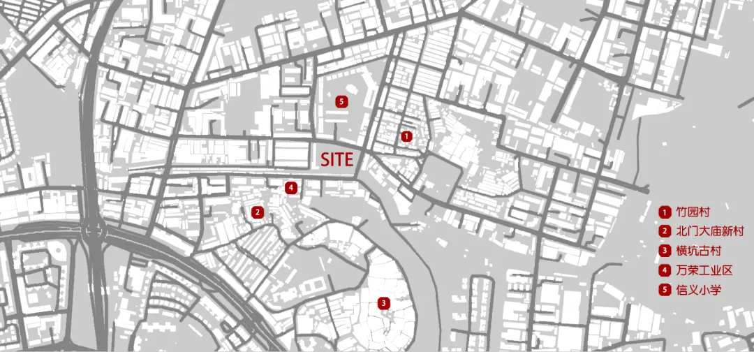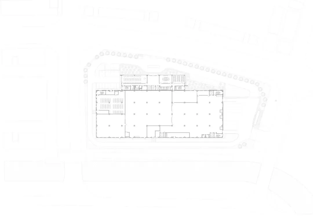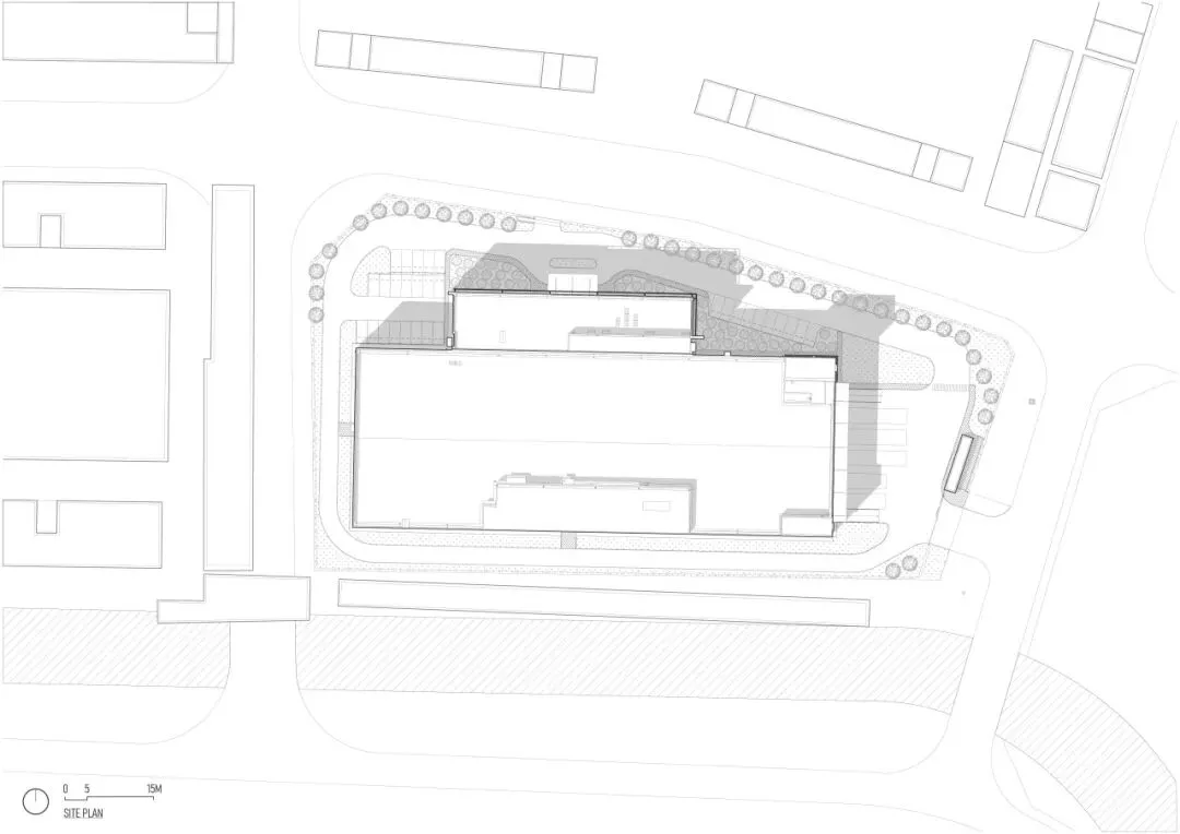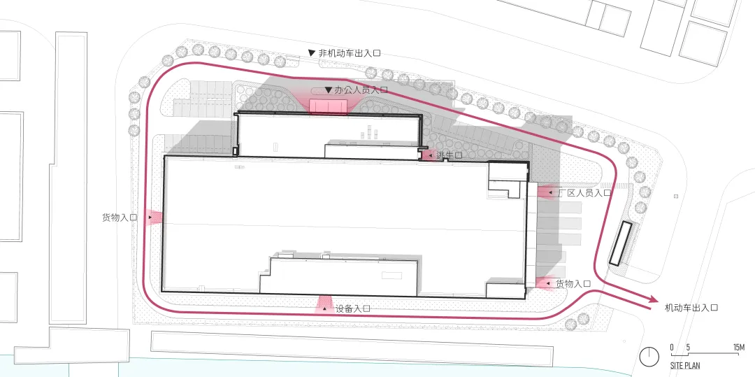 项目位于建成区腹地,北侧为信义学校,南接横竹河,西邻其他厂区,均不便开设车行入口。因应特殊的周边环境和有限的用地面积,设计团队将主入口收设于东侧城市支路,并形成「一条环路+中心量体」的厂区配置格局。