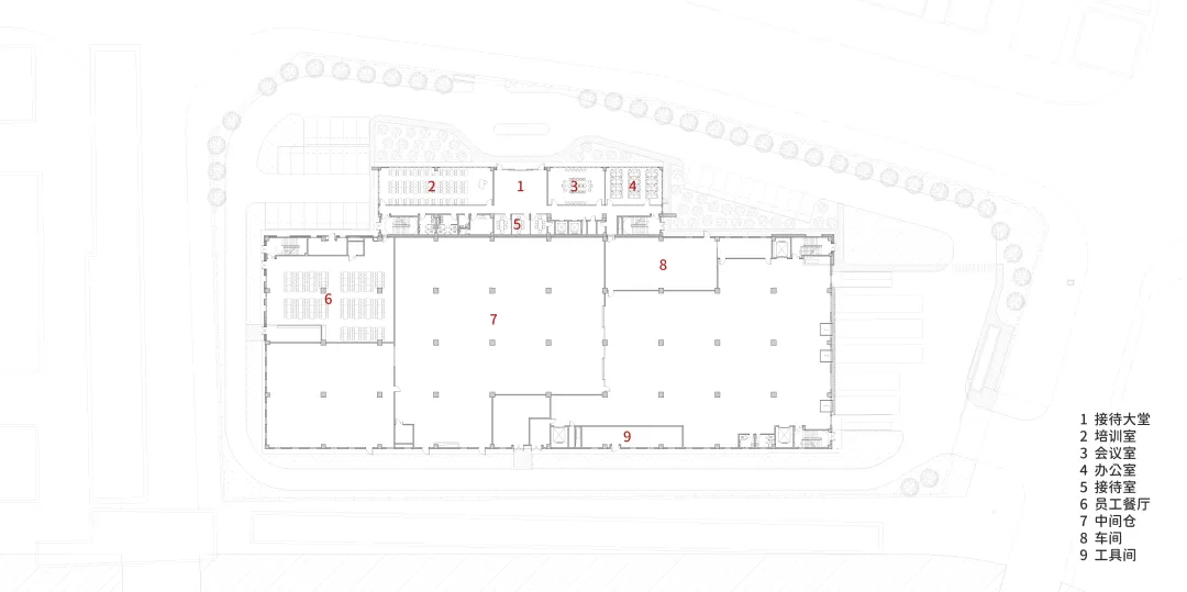 为消解工业建筑的压迫感、建立明晰的内外秩序,JJP以材料与工法的多样组合为切入点,将接待大厅、办公会议、生产车间及员工餐厅等功能空间有机整合。