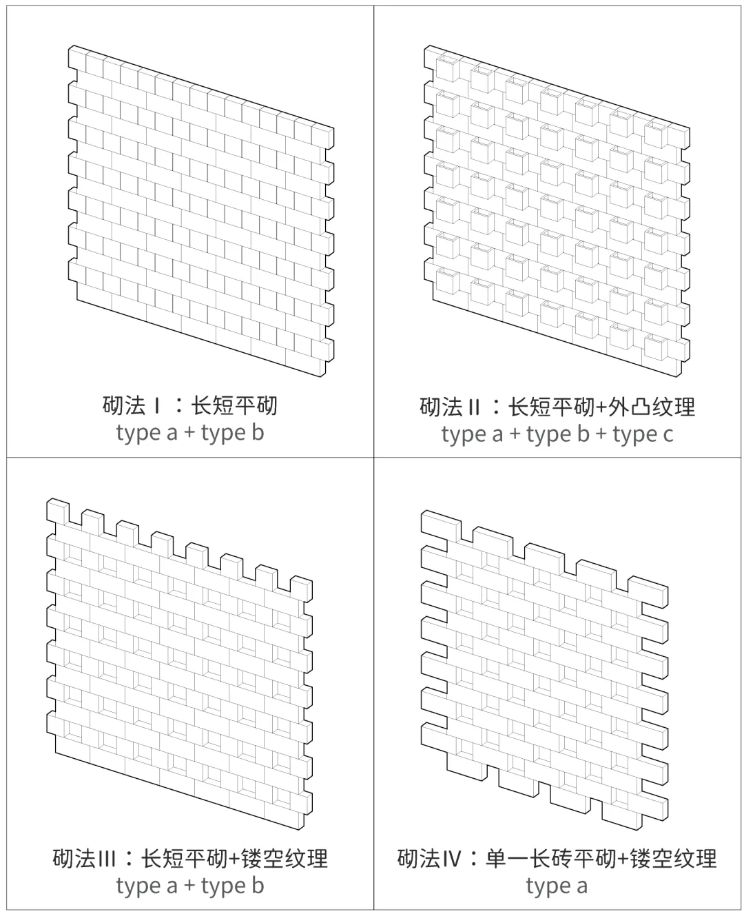 其中,砌法1由长方形与正方形砌体单元(type a + b)交替铺贴,形成基底;砌法2由长方形砌块(type a)横竖交替摆放,创造出外凸正方形砌块的立体纹案。