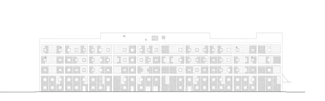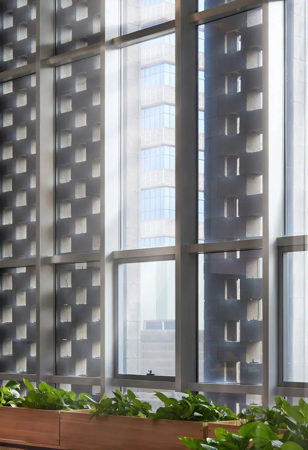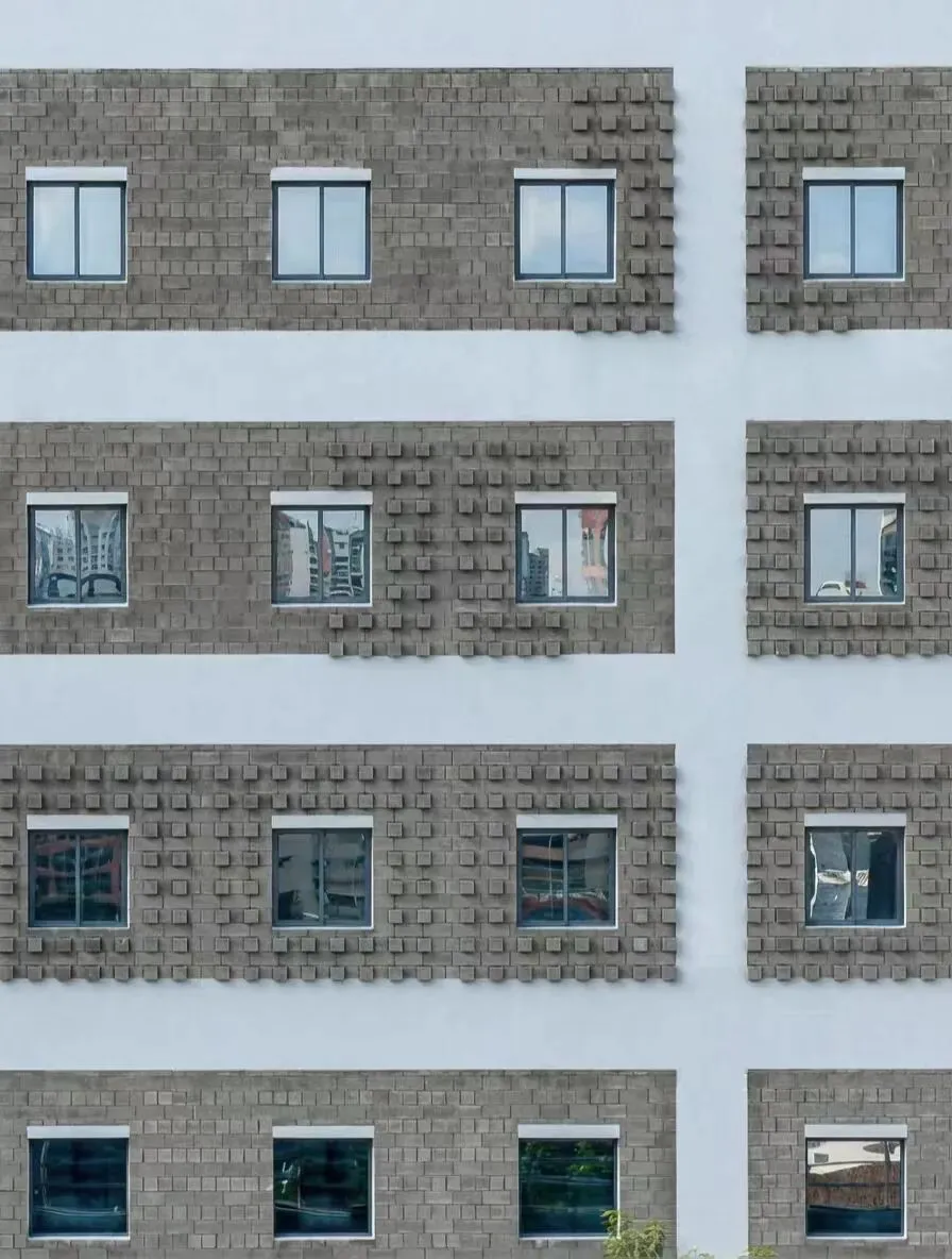 由type c镂空平砌于员工餐厅外立面,结合竖向长窗引自然光入室,既营造出明亮通透的用餐环境,又用花砖的光影变化为工业场域增添趣味。