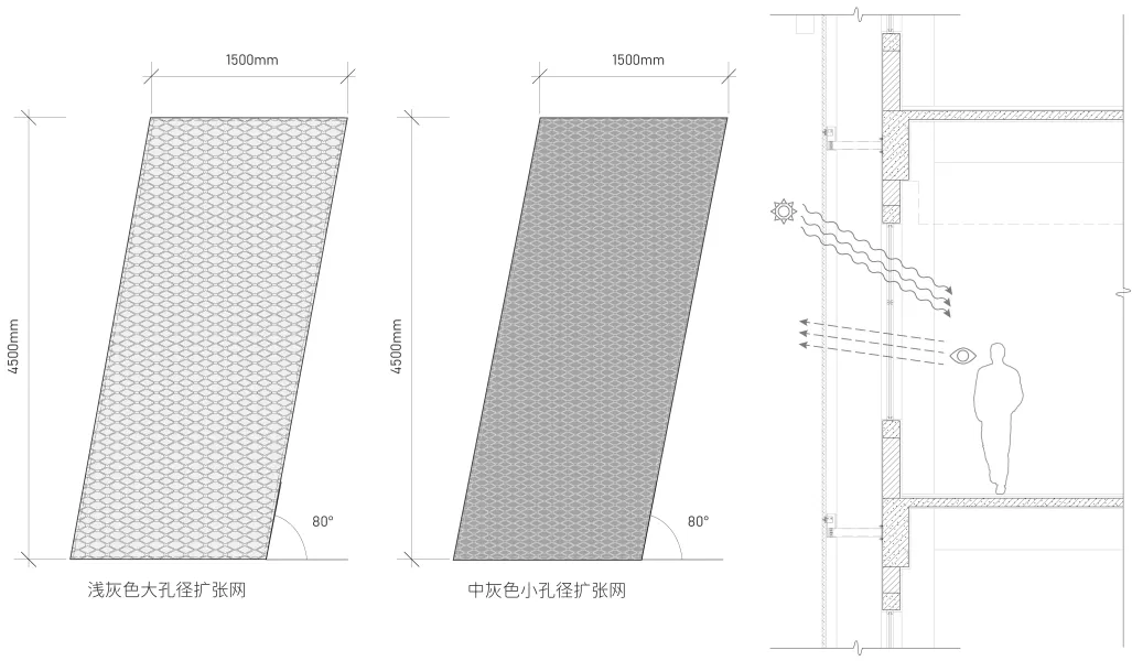 办公区域选用斜向拼接的金属扩张网,如一层轻盈滤幕,在「虚」的玻璃、「实」的砖墙之间形成第三重感知维度,加强立面材料对比产生的视觉张力。