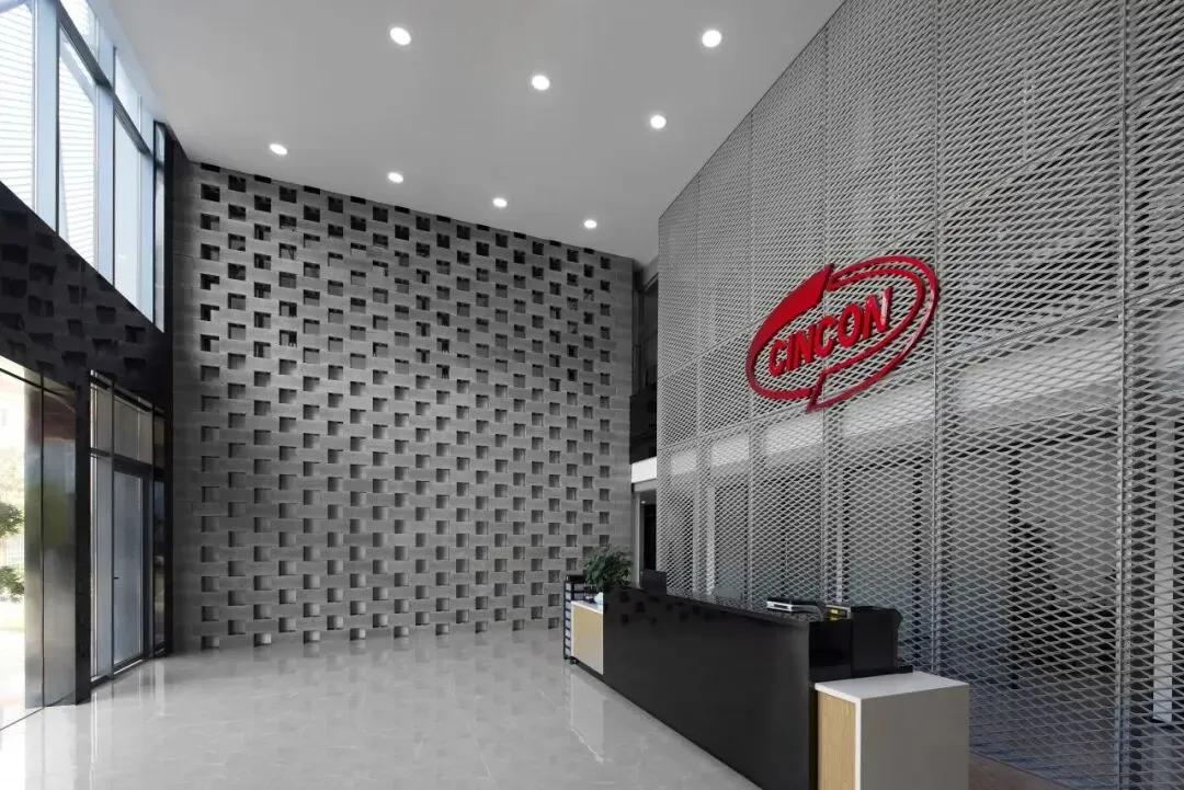 矩阵底纹与80°倾斜扩张网的叠合,既隐喻电路板的连接秩序与电流动势,形成产业属性的特异表达,也为室内空间带来柔和的漫射光。局部出挑阳台,为员工提供半户外休憩场所。