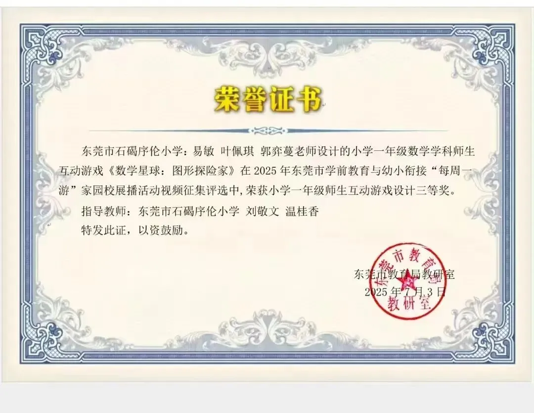 我校易敏、叶佩琪、郭羿蔓老师设计的数学互动游戏,在市“每周一游”展播活动中荣获三等奖,该设计创新融合趣味与学科知识,有效助力幼小衔接。