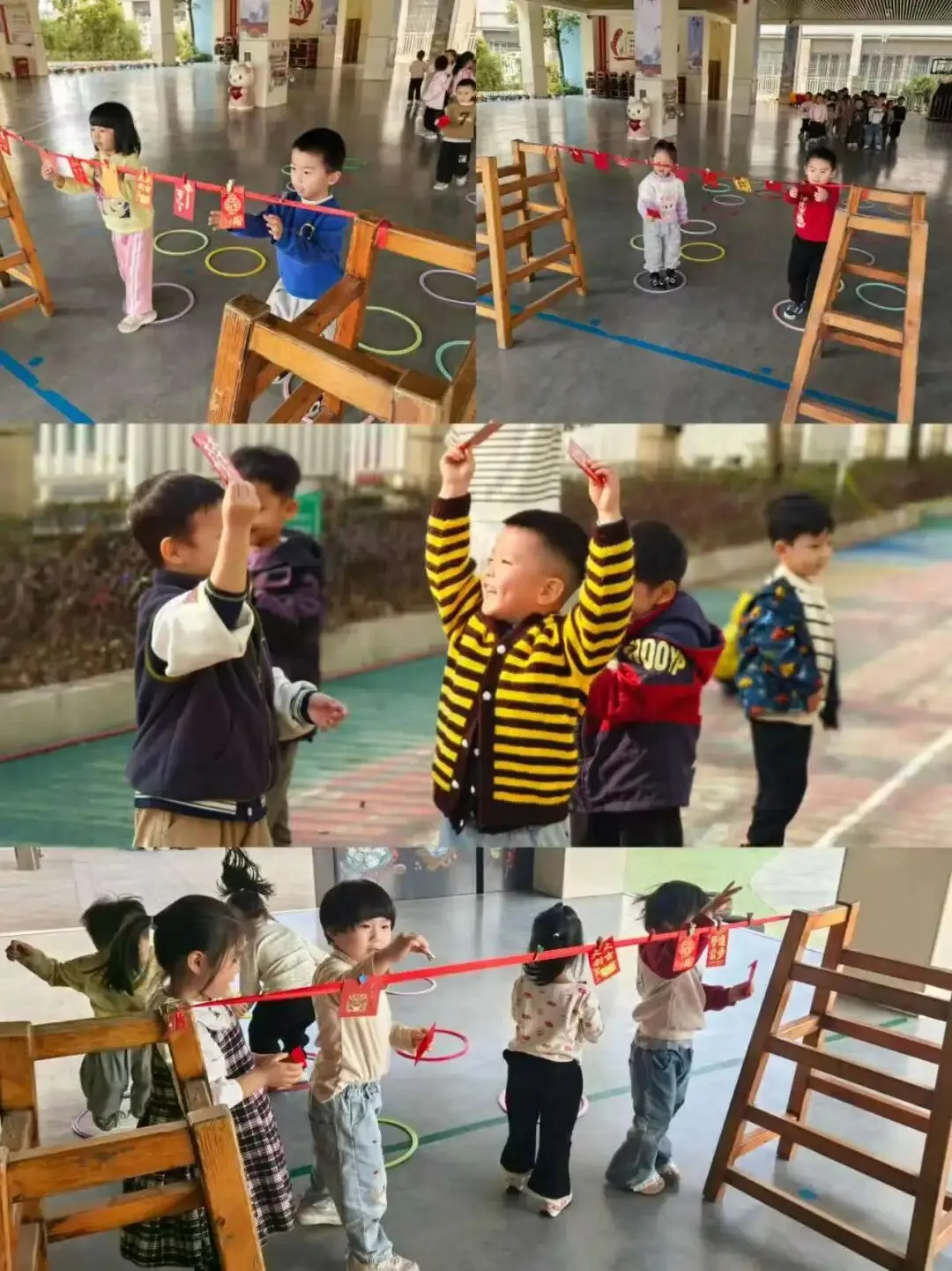 孩子们分队比拼,跳过呼啦圈关卡,冲向终点的红包篮,看哪一队抢得最多,小小的红包里装满了大大的快乐。