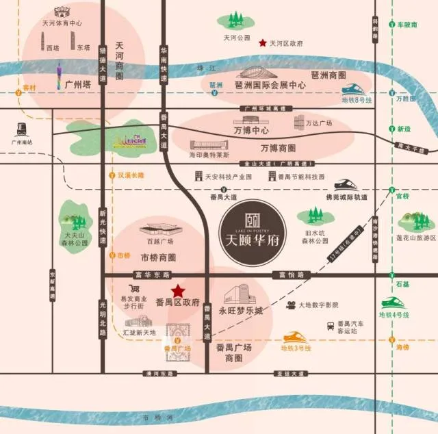 天颐华府位于广州市番禺区中心板块,踞位番禺广场TOD枢纽上,于南沙自贸区以及珠江新城CBD国际金融商圈做到南北相通,成功连接珠三角核心区,属粤港澳大湾区地理中心,占据了一定的地理优势。