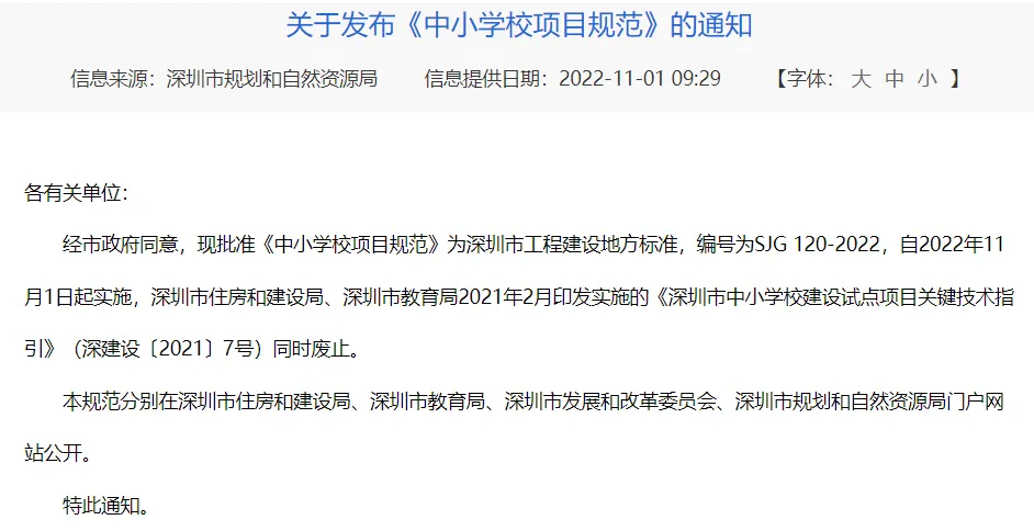 2022年11月1日起实施的、由深圳市住房和建设局、深圳市教育局、深圳发改委、深圳市规划和自然资源局联合发布的《中小学校项目规范》,其中明确小学每班限45人,中学50人。