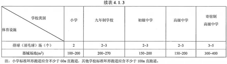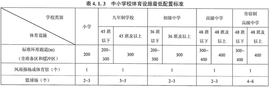中小学必须配备跑道、篮球场、排球场(兼羽毛球场)等,具体详见下表: