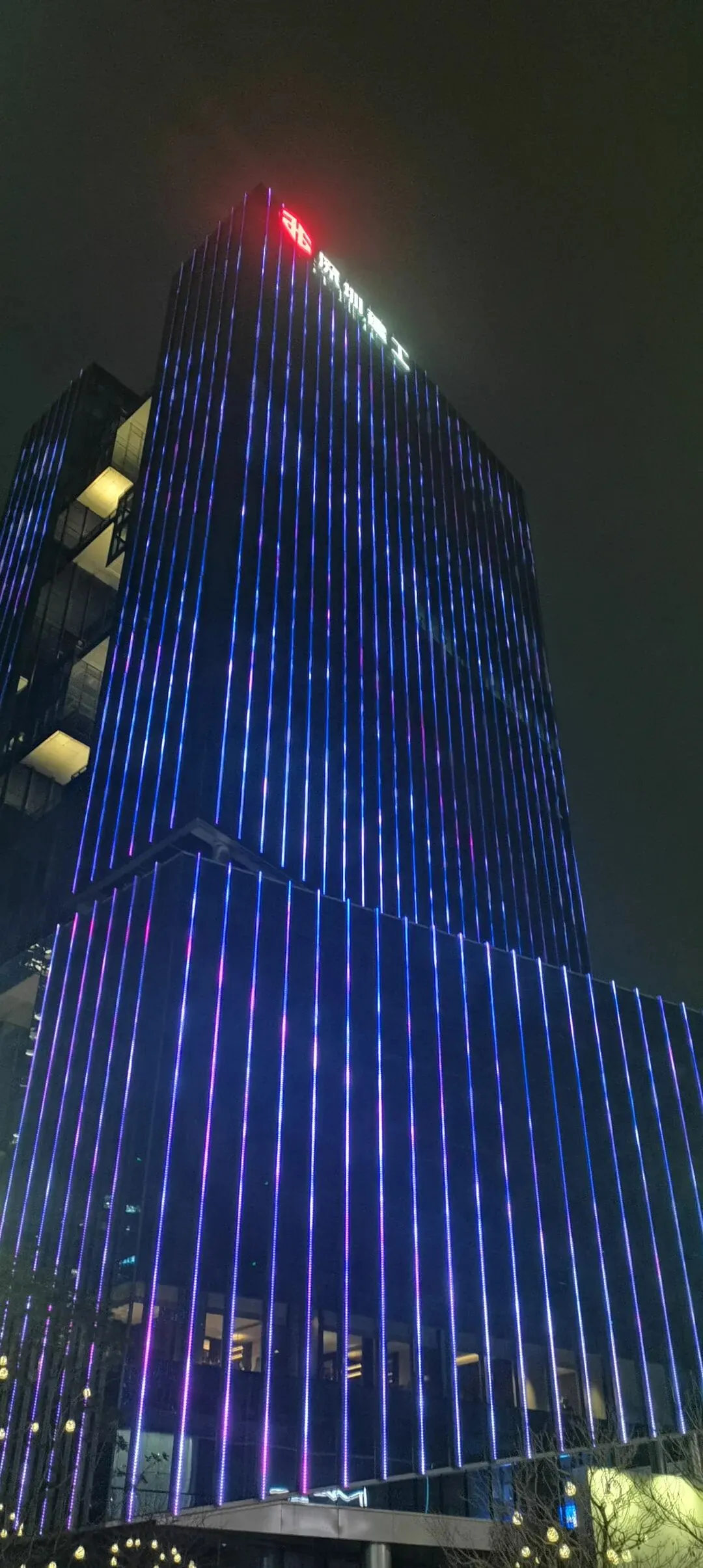 此时夜色已经完全沉下来了,幕墙上倒映着流动的灯光。