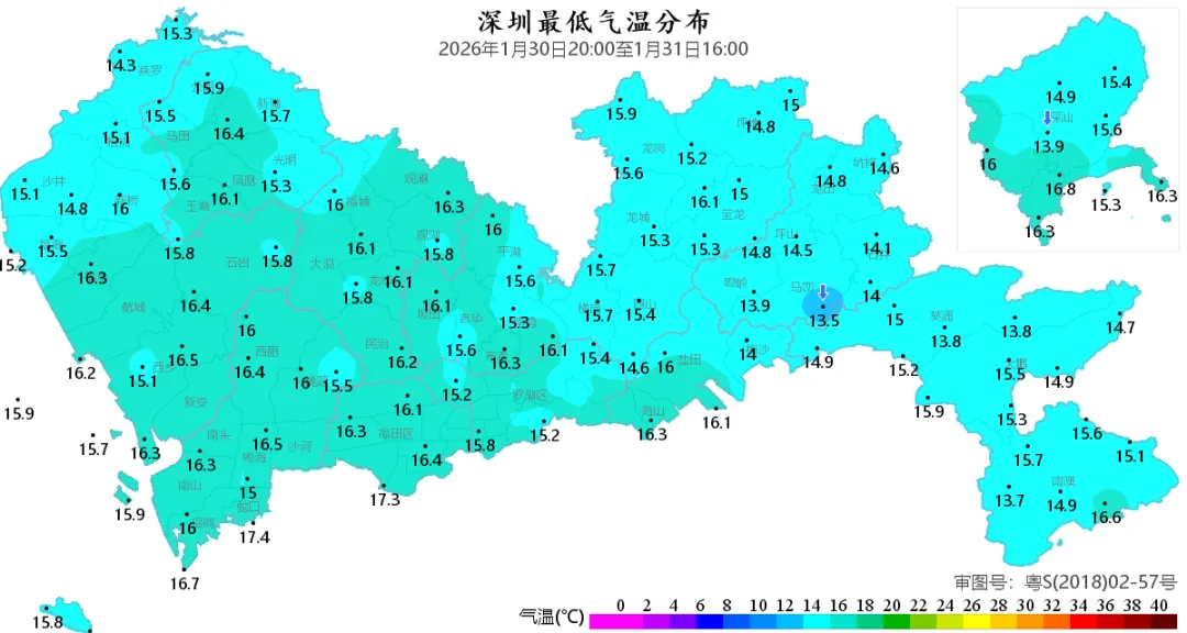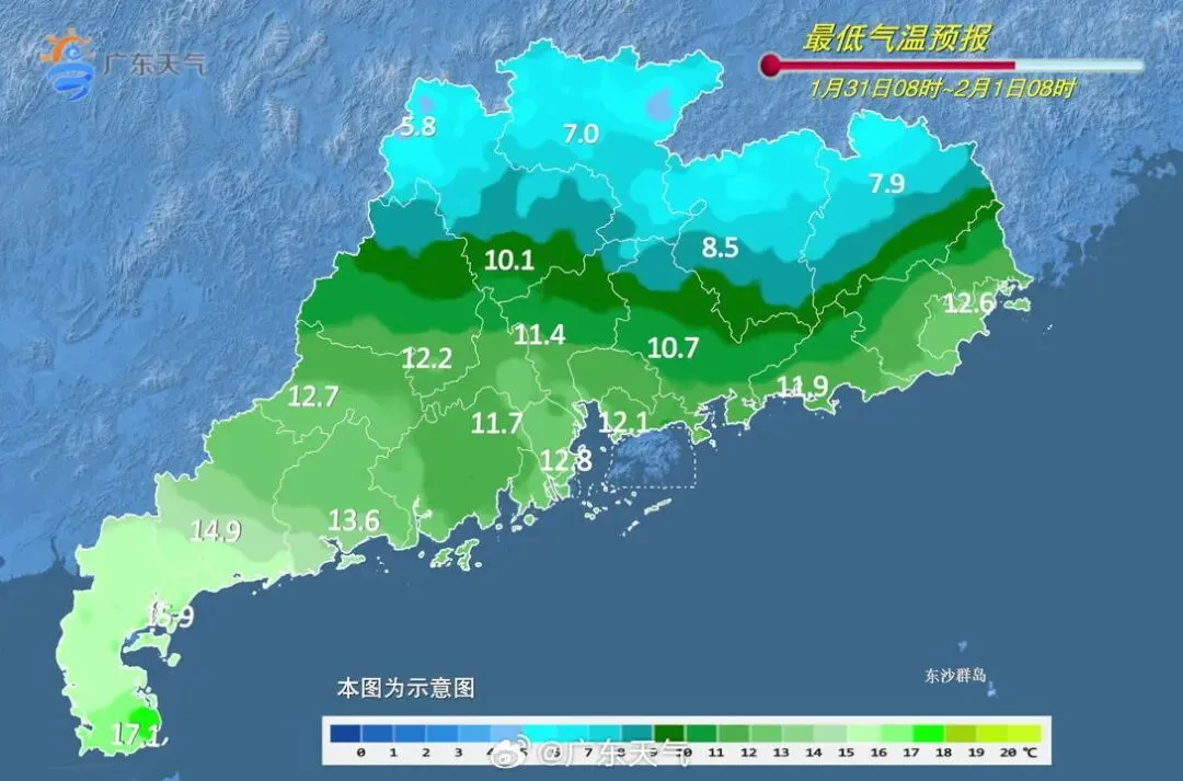 降温方面,预计这次冷空气过程最低气温出现在2月1日或2月2日早晨,粤北部分市县有5℃以下低温(韶关北部和清远北部),高海拔山区2℃—4℃,2月3日起气温逐渐回升。