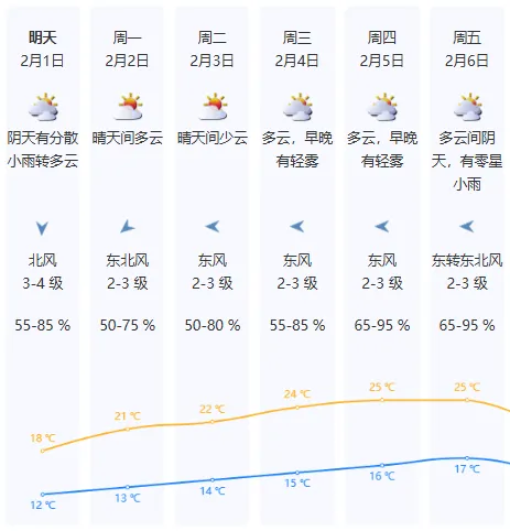 2月1日,阴天有分散小雨转多云,气温12℃—18℃;