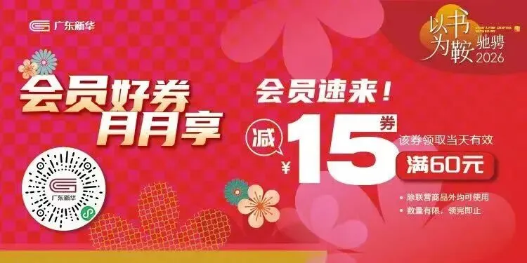 每月发放满60元减15元会员专属优惠劵,会员登录“通读在线”领取,每月会员限领1张,领取当天有效,除联营商品、教科书外均可使用。数量有限,领完即止。