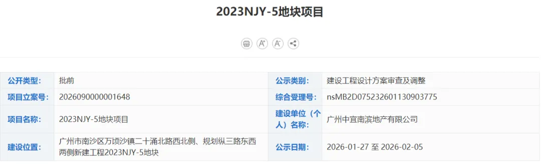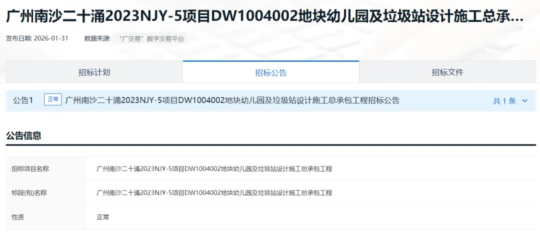 昨天(1月31日),广州中宜南滨地产有限公司发布广州南沙二十涌2023NJY-5项目DW1004002地块幼儿园及垃圾站设计施工总承包工程招标公告。