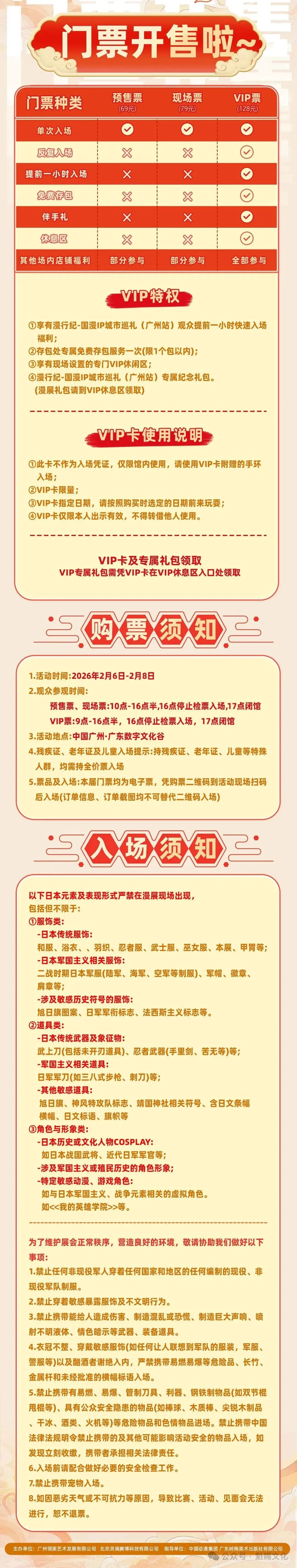 “谷子经济”&数字科技全场景文化生态体验,寒假必去广州新地标打卡地,宅舞大赛,碧蓝航线ONLY专区,国漫ip、国乙沉浸式互动娱乐活动,5大自由行,全国30余位总网粉丝量千万粉丝重磅嘉宾签售等多元体验,动漫周边市集。2026开年一次不出场馆吃喝玩乐一条龙的国漫游玩体验。