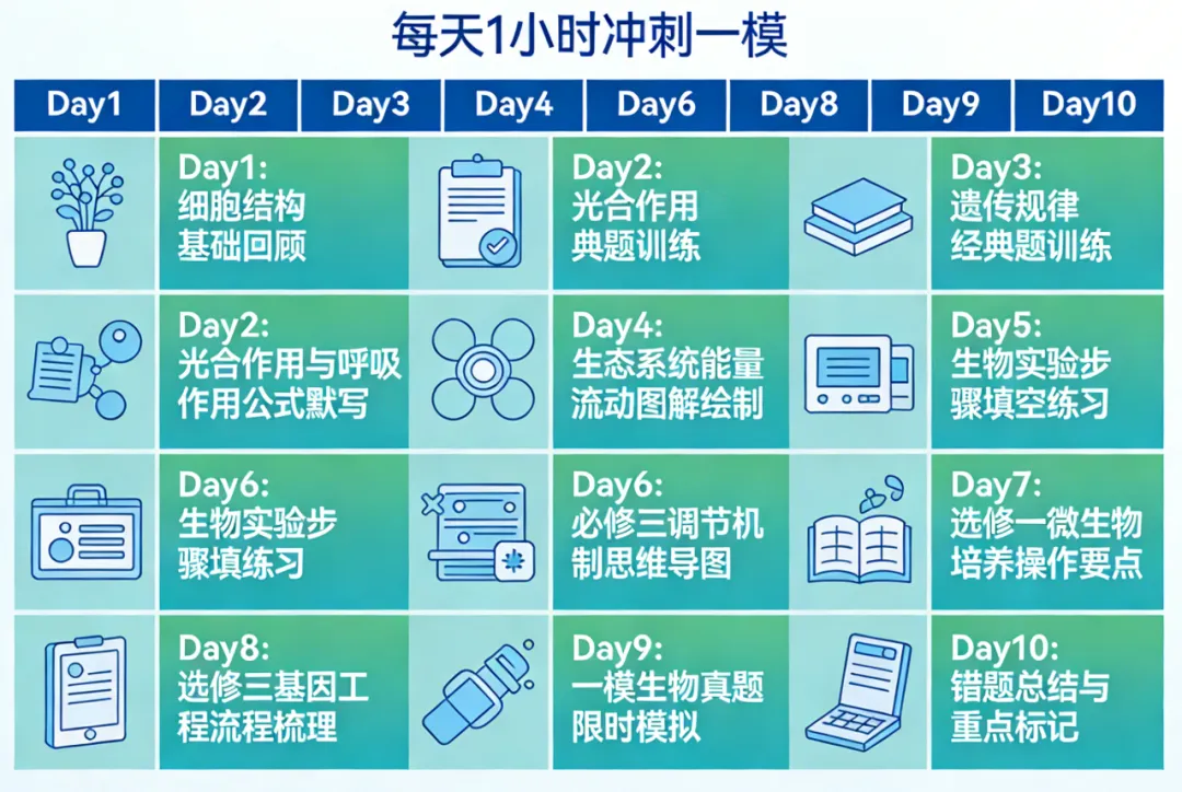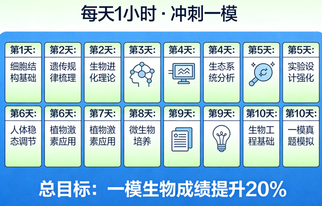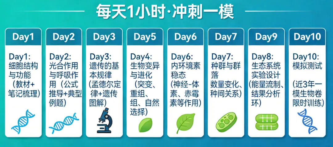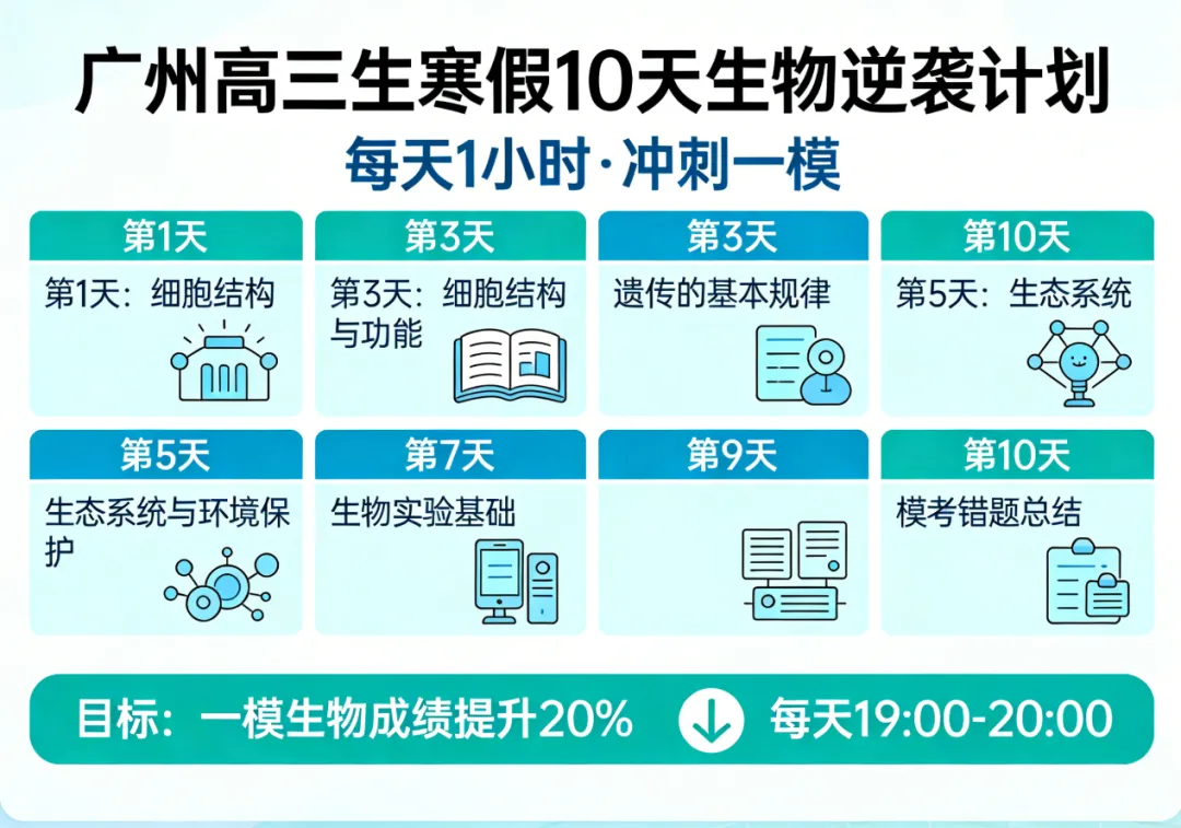 ↑关注我,回复“练习”,即可领取《高中生物全套练习资料+高考生物思维导图》这几天,我陆续收到不少高三家长的咨询,语气都很急迫:"黄老师,孩子2月底才放寒假,3月中旬就要广州一模了,这个寒假生物该怎么安排?"昨天,一个天河区的家长带着孩子来找我,孩子一脸疲惫地说:"学校第一轮复习还没结束,每天作业都写不完,寒假还想报全日制辅导班,但又怕效果不好......"这让我意识到,今年广州高三的寒假确实特殊——假期晚(2月17日春节)、时间短、任务重。更重要的是,广州一模的成绩往往与最终高考成绩相差在60分以内,这次考试几乎决定了后续复习的节奏和信心。今天,我为大家制定一份2月14日至2月24日(年初八)的10天生物冲刺计划。目标是:每天只花1小时,实现深度学习,为一模做最后准备。一、认清现状:不同分数段,不同战略