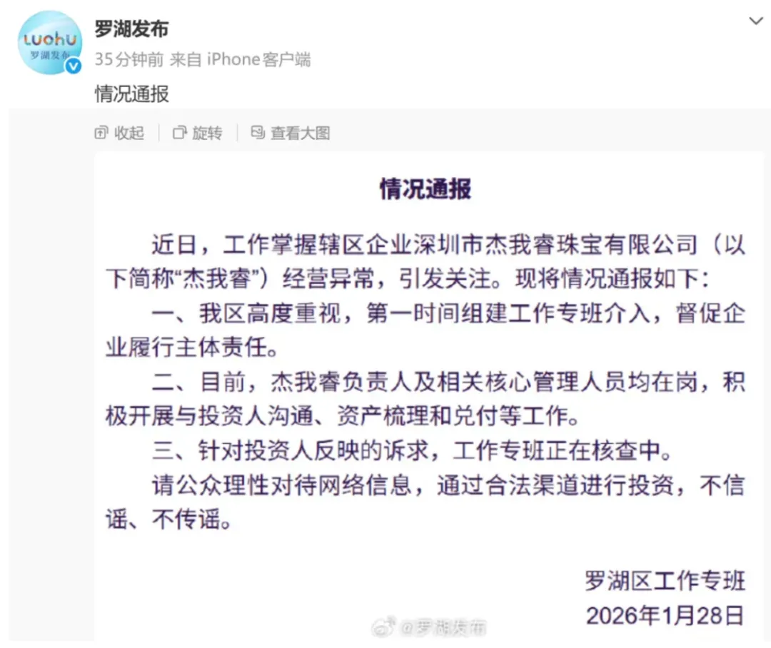 1月31日,深圳市罗湖区工作专班发布情况通报,披露介入处置深圳市杰我睿珠宝有限公司(以下简称杰我睿公司)经营异常事件的最新情况。通报中提到,在工作专班督促下,杰我睿公司处置资产、筹集资金,已启动兑付。杰我睿公司已开通线上签约兑付渠道,并设立线下接洽办理点,地址位于罗湖体育馆,罗湖区罗沙公路经二路48号。在工作专班监督下,杰我睿公司已委托第三方专业机构对公司经营情况进行审计。初步结果显示,网传金额明显夸大。此外,相关部门正对各类线索进行核查,将依法依规处理。多家类似平台小程序被暂停服务