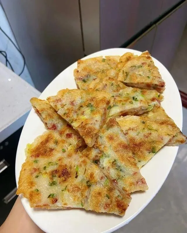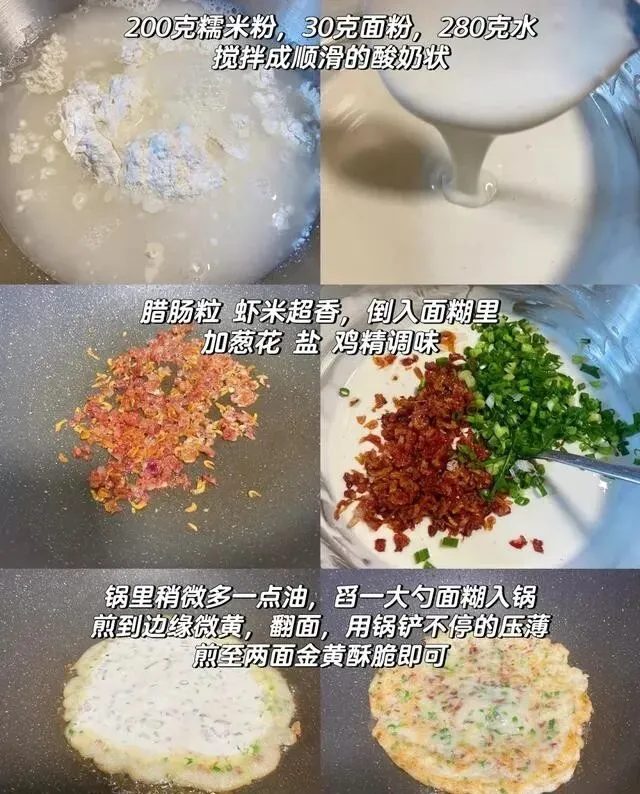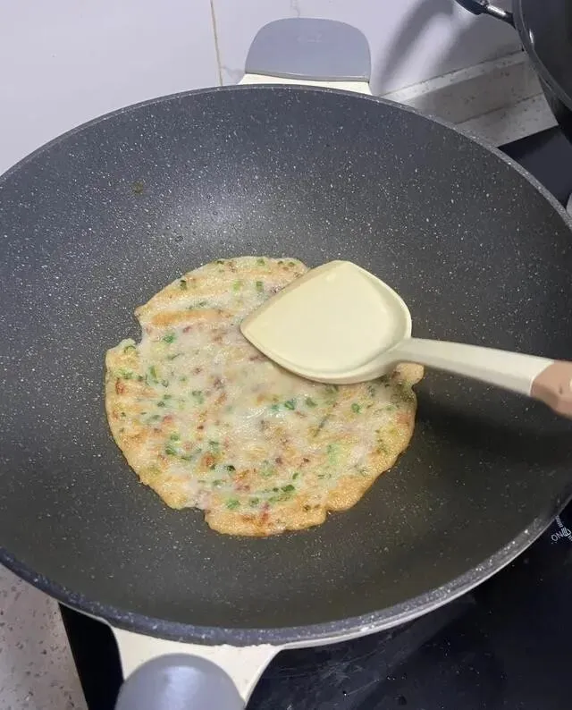 水别一次倒完 , 太稀了煎出来不成型 , 很难翻面的。