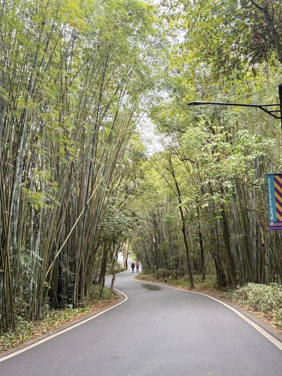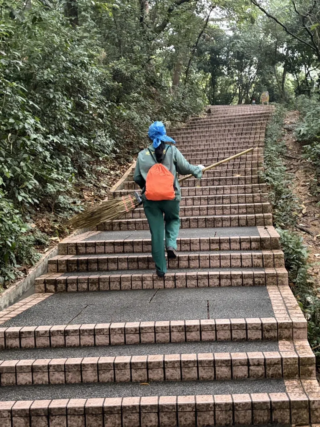 再往上,雨丝密了些。雾从林子深处漫出来,路的前方变得白茫茫的。就在这时,前方石阶上出现了一个人影。是个环卫工人,穿着一身绿工服,头上套着个蓝色的塑料袋权当雨帽,手里握着一把长长的竹扫帚,正一步一步往山上走。她的背影在空寂的山道上显得很小,可步子却稳。这景象,忽然就让人心里静了下来。什么“千里走单骑”的比喻,此刻都觉得过于隆重了。她只是在这样一个平常的清晨,走上她熟悉的山道,去做她日复一日的工作。这山间的洁净,有一份是这么来的。人与山,在这微雨的清晨,达成了一种默然的契约。