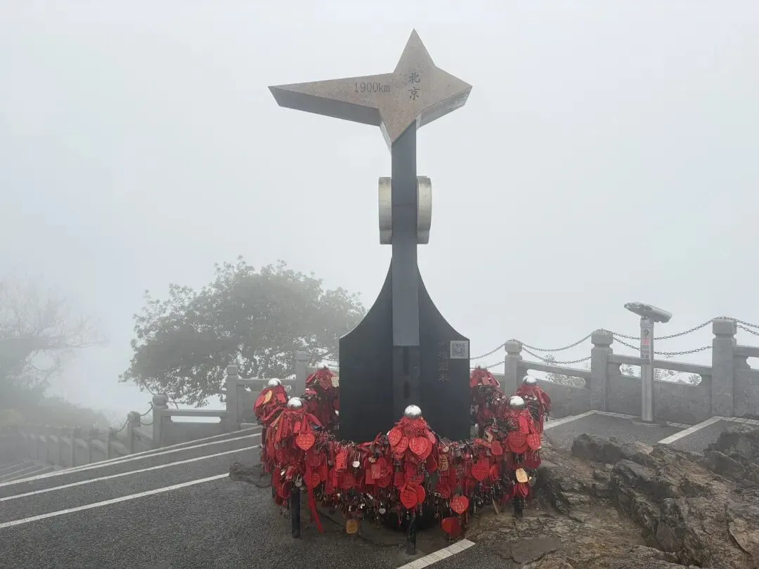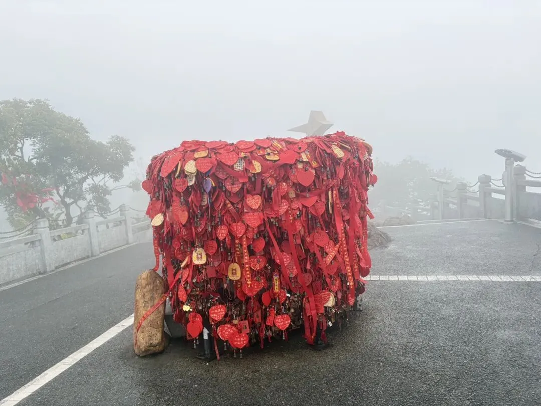 目标很明确,摩星岭顶。路牌在雾中指引,石阶仿佛没有尽头。直到看见那块被无数红色祈福牌几乎淹没的心形铁架,和旁边那个刻着“1900km 北京”的星形地标,才知道到了。海拔382米。数字不大,但在这风雨云雾中走上来,自有一番体悟。地标旁,那些层层叠叠的红色牌子,每一面都写满了字,系满了结。它们和山下那位沉默的环卫工人,和石凳上那朵孤独的落花,和这满山不凋的绿意,和此刻笼罩一切的雾与雨,奇妙地交融在一起。