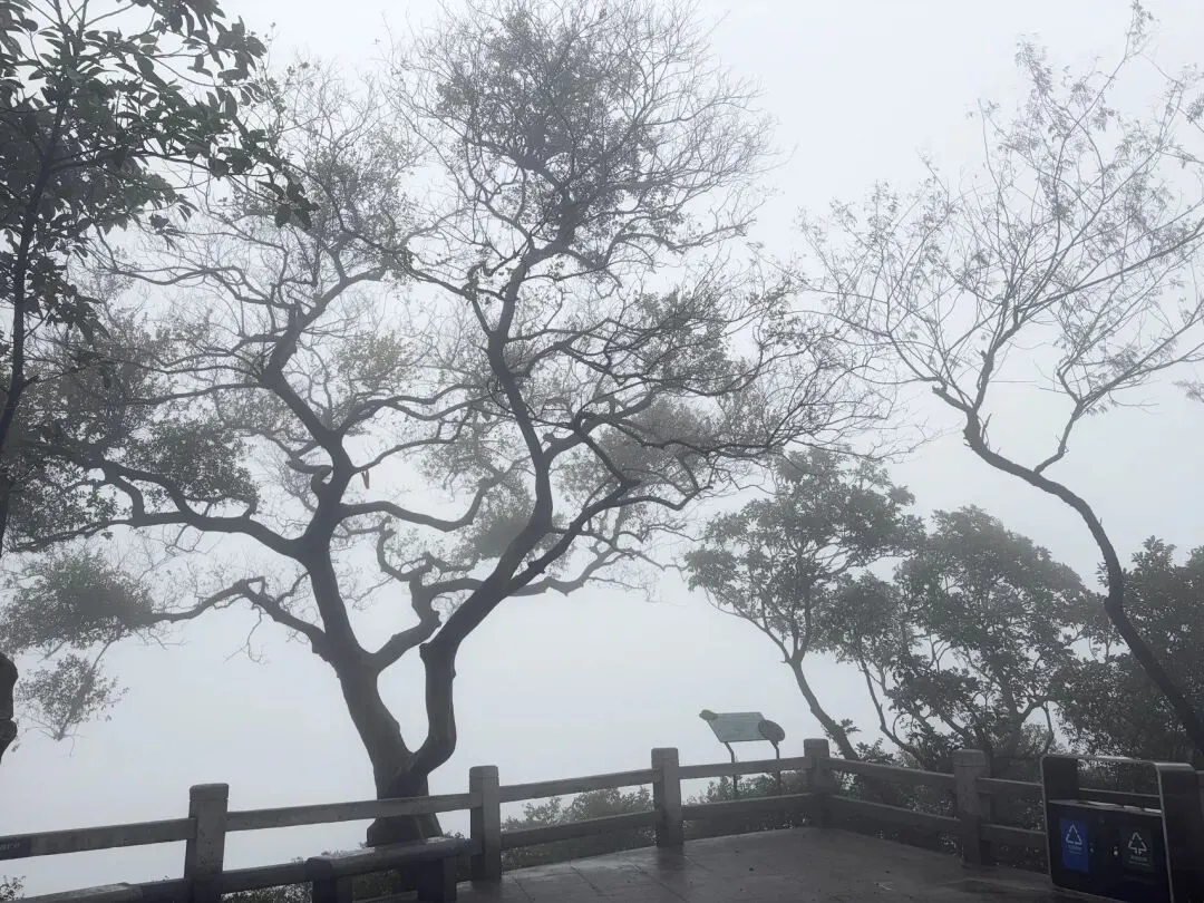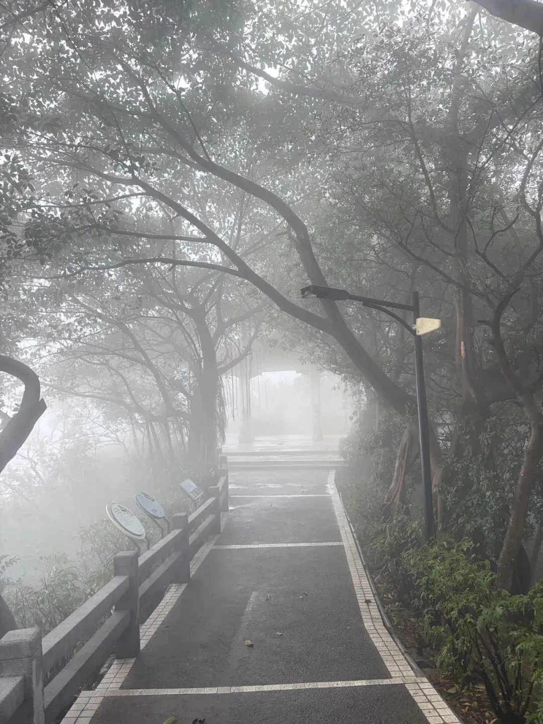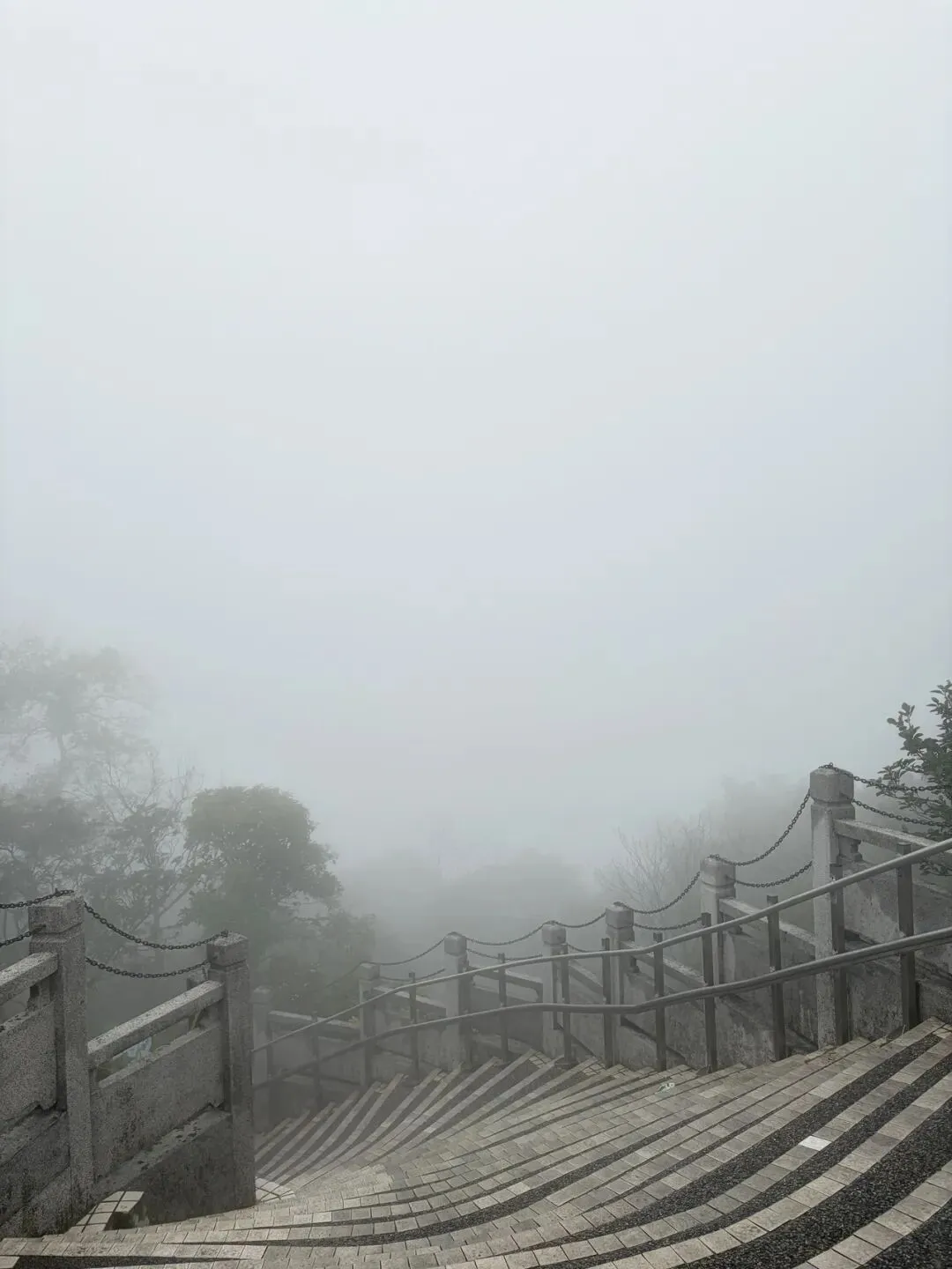 后面的路,便真是在云里走了。路两旁的树成了墨色的影子,栏杆湿漉漉的,偶尔能看见系在上面的红色祈福牌,在流动的雾气里时隐时现,像一团团凝固的、沉默的愿望。一切都安静极了,只有自己的脚步声和雨落在衣服上的簌簌声。这大概就是真正的“云山”了。不见山峦的形貌,只感其气息;不闻尘世的喧嚷,只听自然的天籁。古人说“山色空濛雨亦奇”,说的便是这种境界吧。那“奇”,不在于看到什么惊人的景色,而在于身心完全浸入了一种被洗涤过的、朦胧的孤独里。
