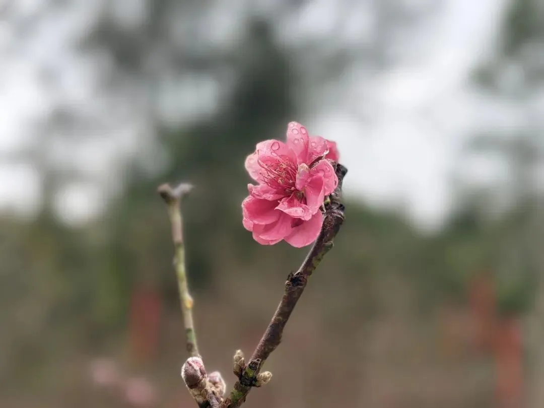 这“桃之夭夭”的盛景尚未来到,眼前只是序章,却因这雨,这静,这“养在深闺人未识”的意味,反而更动人心魄。古人说“小桃枝上春风早,初试薄罗衣”,此刻没有春风,只有冻雨,这“薄罗衣”便穿得格外我见犹怜。