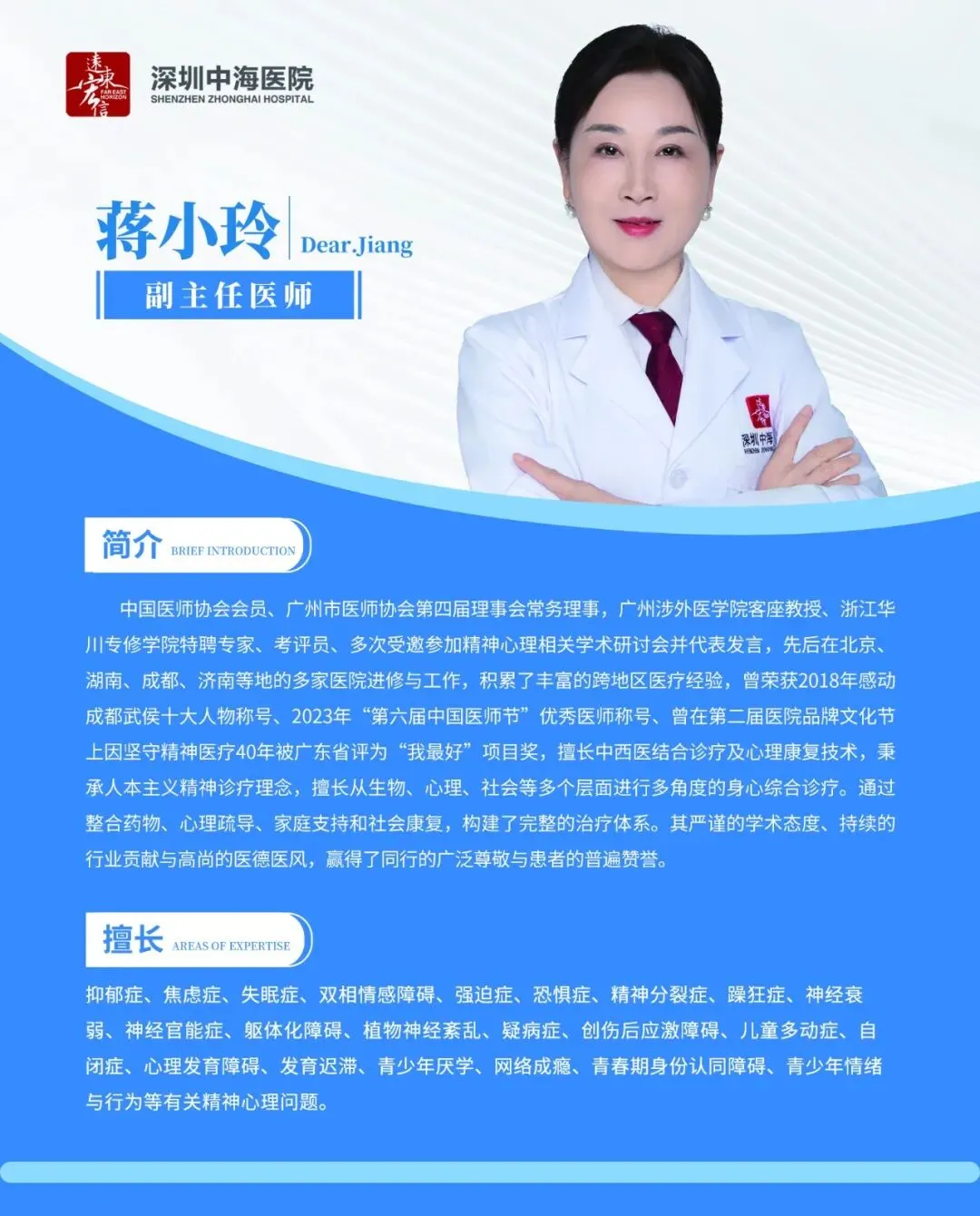 深圳中海医院的蒋小玲副主任医师拥有超过30年的精神科临床与心理咨询工作经验,擅长运用中西医结合及心理康复技术,为受抑郁症、焦虑症、失眠症、强迫症等问题困扰的人提供综合诊疗。