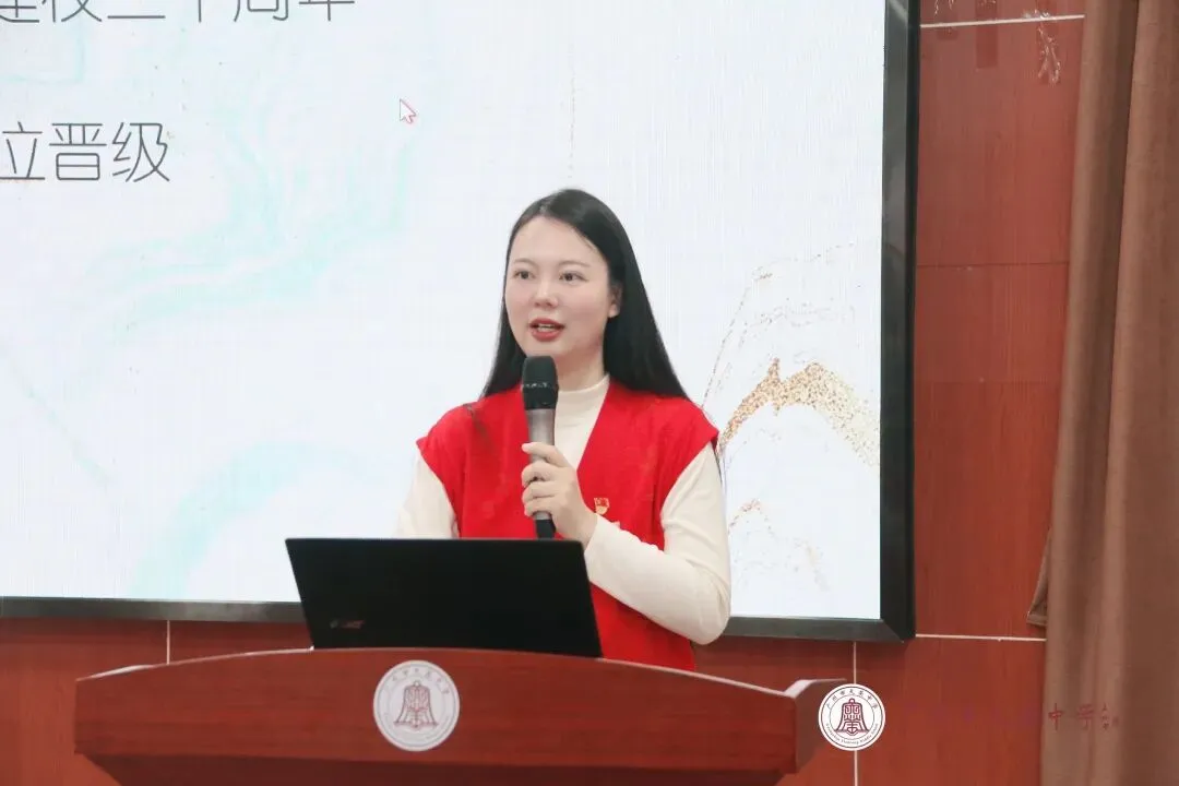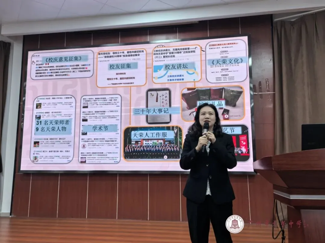 办公室主任黄雯以“三十而立,星光共赴”为题分享她“致敬建校30周年”活动中统筹管理、对接资源的心得与体会。办公室团队展现出极强的组织力与执行力,在任务繁重、时间紧迫的情况下,凝聚多方力量,实现了从策划到落地的全程推进。这些工作不仅为校庆活动增添了厚重的历史感与人文温度,也展现了天荣人团结协作、精益求精的精神风貌。