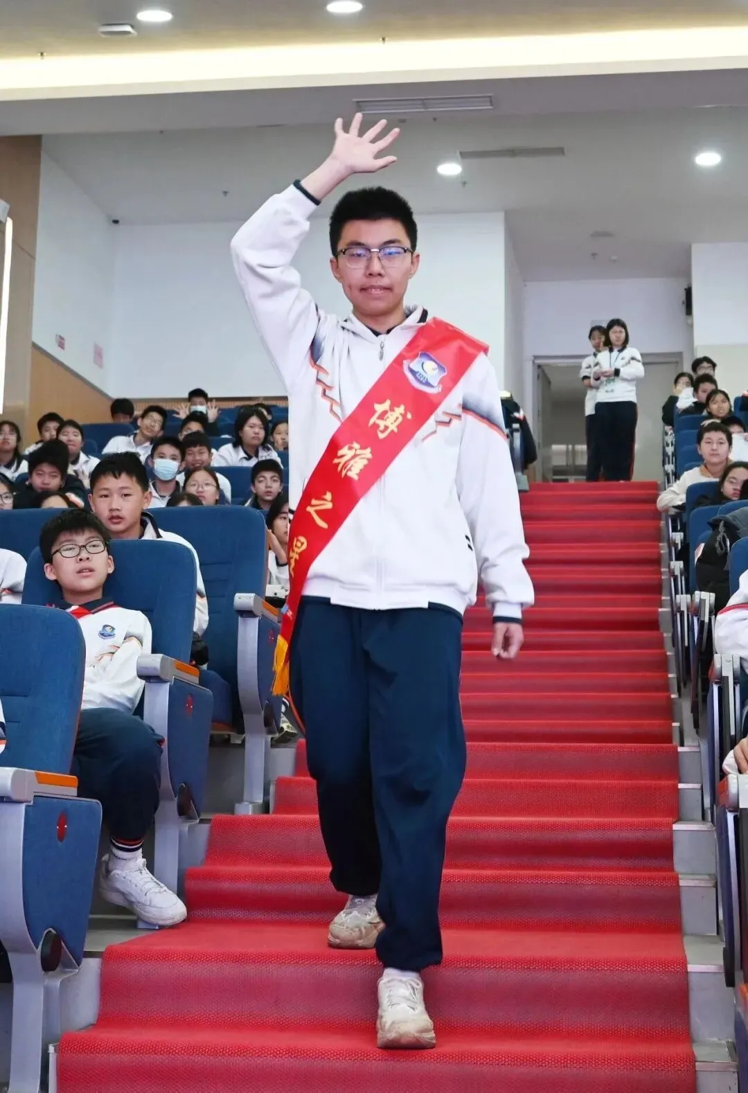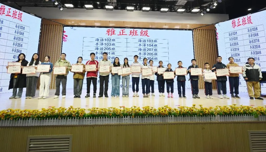 典礼进入激动人心的表彰环节,王烨副校长宣读了本学期各类优秀学生名单,包括“博雅学生干部”“三好学生”“文明学生”“进步学生”“卫生标兵”等。王烨副校长、王立主任先后为“博雅班级”“雅正班级”颁奖。一份份荣誉,是对辛勤耕耘的最好回馈,更是对“人人皆可出彩”校园文化的有力诠释。