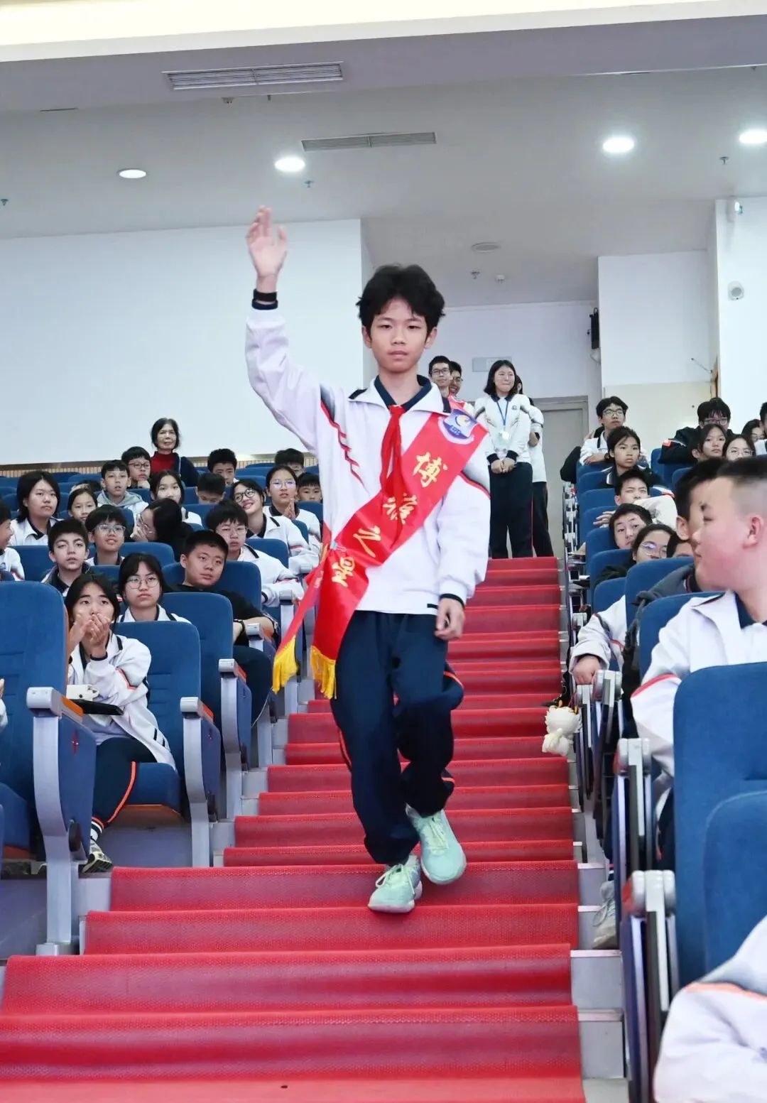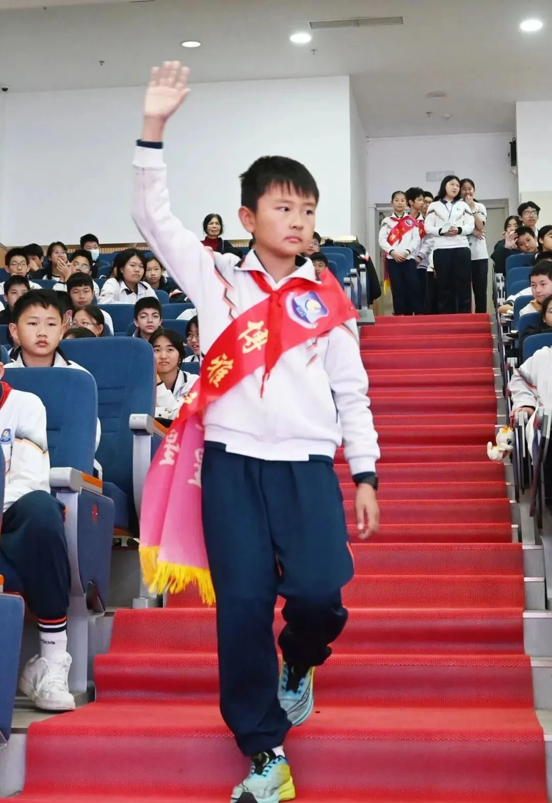 典礼在主持人热情洋溢的开场中准时开始。室内升旗仪式庄严举行。全体师生肃立,注视国旗,齐唱国歌。这一刻,爱国情怀与集体荣誉感在每个人心中激荡。