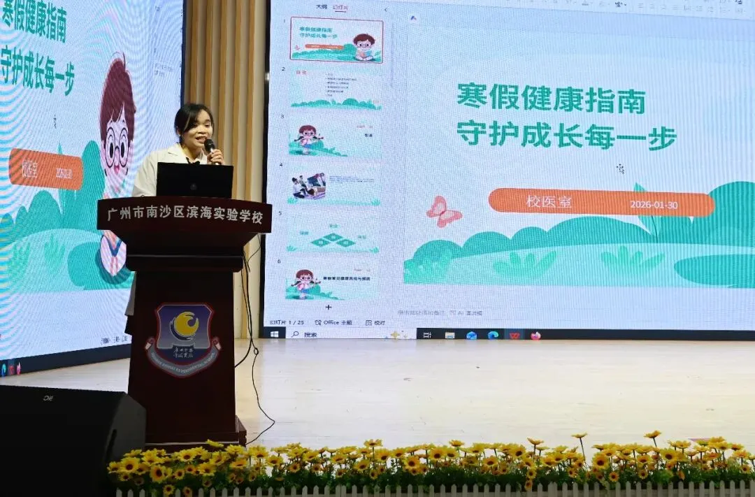 黄雪亮校医给师生们带来了健康教育,引导同学们科学规划假期生活,保持良好作息,加强锻炼,以健康身心迎接新学期。