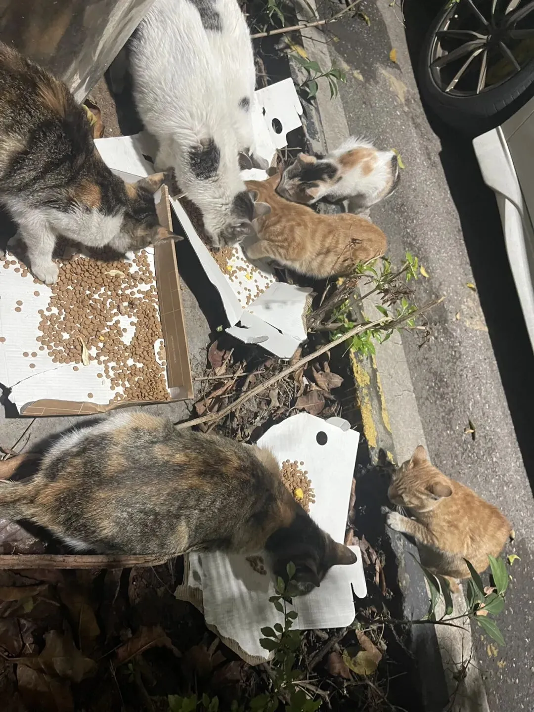 半个月连轴转,终于偷得半日闲溜达广州,夜里十点才回。心心念念着几天没喂到猫粮,火急火燎去驿站取了猫粮就往宿舍方向,小家伙们饿坏了,等开包时凑在一起争抢不停。昨夜的雨打脏了所有一次性碗,只能临时用硬纸皮当食台。今早下雨时怕猫咪挨淋,留了纸箱给它们躲雨,出门游玩没及时收走,不料竟因此被投诉