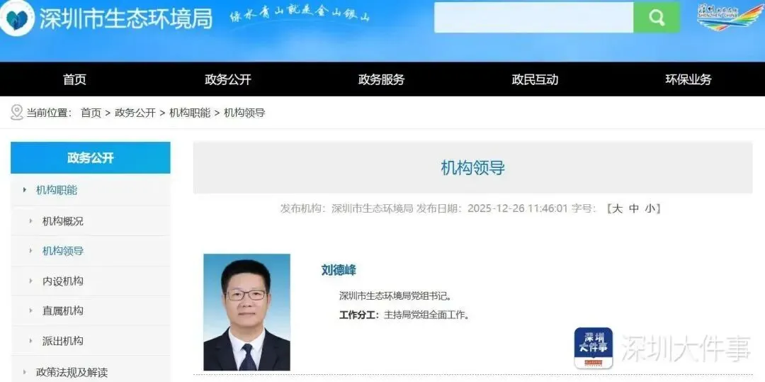 深圳市生态环境局官网信息显示,刘德峰已任该局党组书记,主持局党组全面工作。公开资料显示,刘德峰,男,1972年11月生,汉族,广东省大埔县人,大学理学学士。2018年8月至2021年9月,刘德峰任深圳市光明区委常委,区人民政府副区长(2018.10)、党组副书记;2021年9月至2021年12月,任深圳市大鹏新区党工委副书记,光明区政府副区长;2021年12月至2022年9月,任深圳市大鹏新区党工委副书记;2022年9月至2025年12月,任深圳市气象局(台)党组书记、局(台)长。