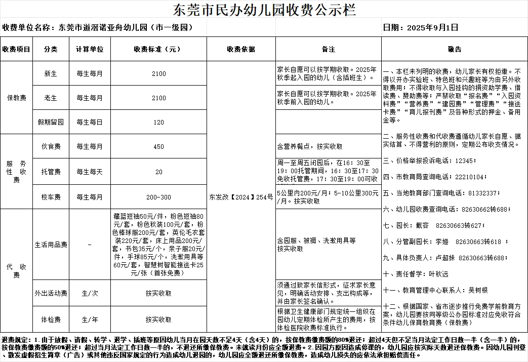 东莞市道滘诺亚舟幼儿园收费公示栏
