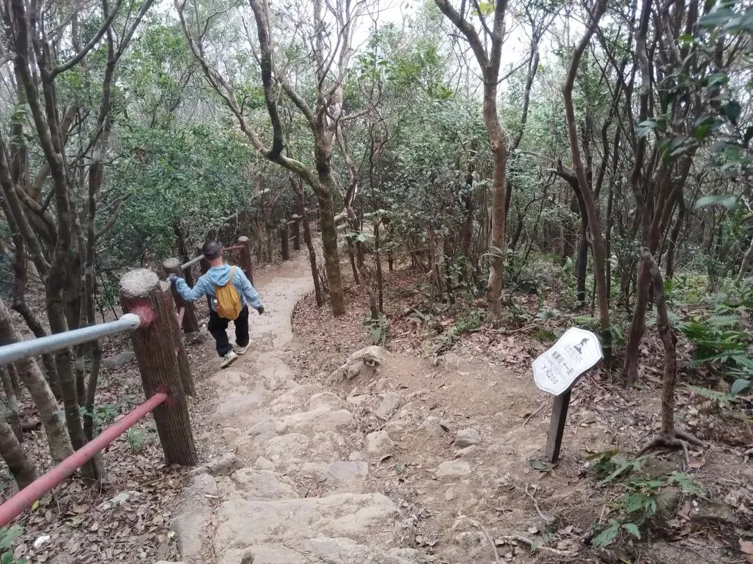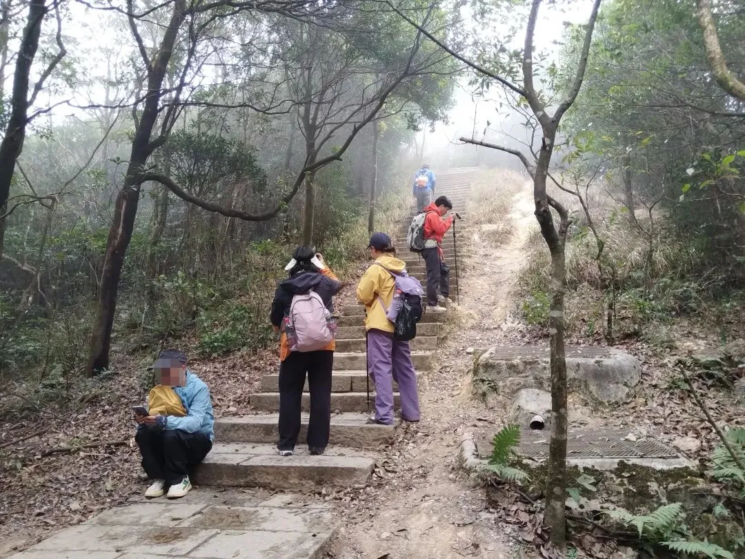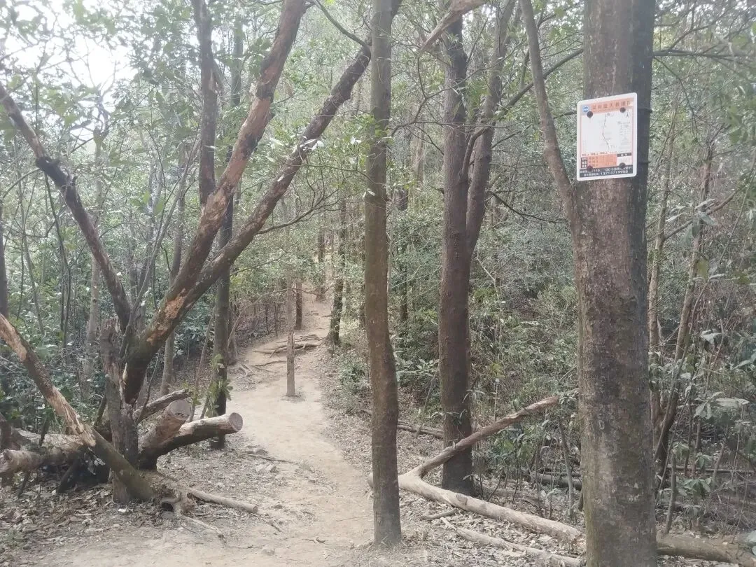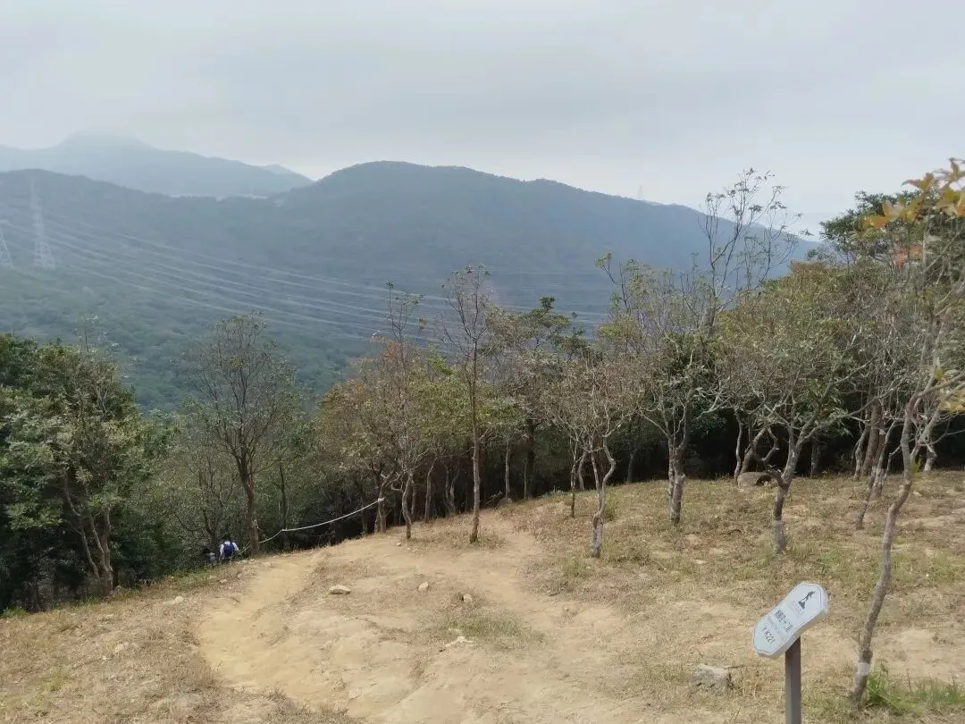 当然我能果断行动,主要还是来自某位山友的发帖约伴同行,当日9:30我们一群10人相约自横排岭公交总站准时出发,从梧桐山河源头的横沥口水库旁边的登山口前往百年古道山脊线。沿着山脊土路缓缓而上,走走停停,故意放慢速度,只为了等候两位落后分子,没想到我们从海拔高度为777米的岔口,走捷径斜切到正规蹬道,又等了有近二十分钟,才终于见得她俩吭哧而至。后来登顶时发觉大梧桐之巅的气温只有十多度,冷得我们无法久留,因此在“鹏城第一峰”打卡拍照后,我们便赶紧径直从攀云径先后疾行而下。下到山脚的绿道后,我们没有按鲲11的路线翻越梅香岭,而是沿着爬升较少的绿道途经驿站卫生间前往谭仙公庙(鲲11与鲲12的分界处)。后面沿着鲲12的路线翻过嶂顶,我们也在低处提前切到绿道上,并在前方拐弯处从“木瓜小道”上端走捷径直接爬到蓄能上库的库坝路面。沿着库坝前往登山口,离开库坝后,我们只用了半个多小时就登上了第三峰梅沙尖的观景台。与梧桐顶类似,这里也是“风吹冷气”,逼得我们只能赶紧下山。沿着石阶下到靠近云海广场的瞭望塔附近时,我认出了十多年前由此上行往梅沙尖的拦道铁丝网,竟然还清晰可见,让人觉得既亲切又沧桑。过了瞭望塔,沿着“云海5线”下行,其终点便是地铁8号线的盐田墟站,自此归去,倒也甚为便捷。沿着这样的路线连走梧桐山和梅沙尖,总长约为20公里,累计爬升约为1650米,以前我总觉得难度有些大,不敢尝试,这一次因为天气很给力(凉爽又不晒),前两三个小时又歪打正着(等候队友的过程中保存了足够的后劲),加上队友的相互鼓劲,最后我竟然完成得貌似很轻松。看来“路虽远,行则将至”,这话有时还真的是至理名言呢!