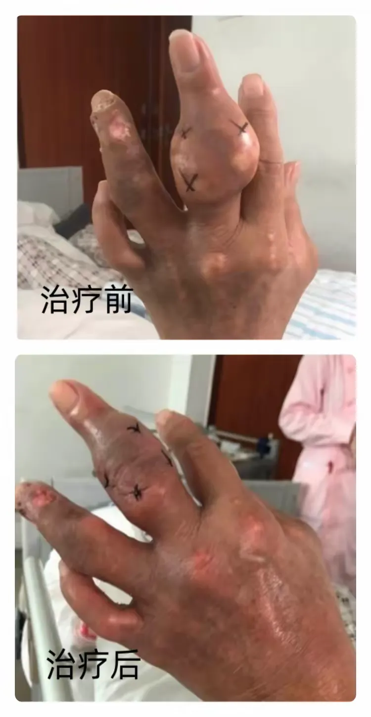 水筋针和经筋刀等器械,疏通经络和水通道,逐层清理沉淀在关节内、外的痛风石结晶体,快速微创剥离病变组织,松解关节粘连,能够有效消除关节疼痛,恢复活动功能,并全面保护患者的正常组织免受疾病侵害,术后迅速解除疼痛,红肿等症状很快消失,关节变形得到矫正。
