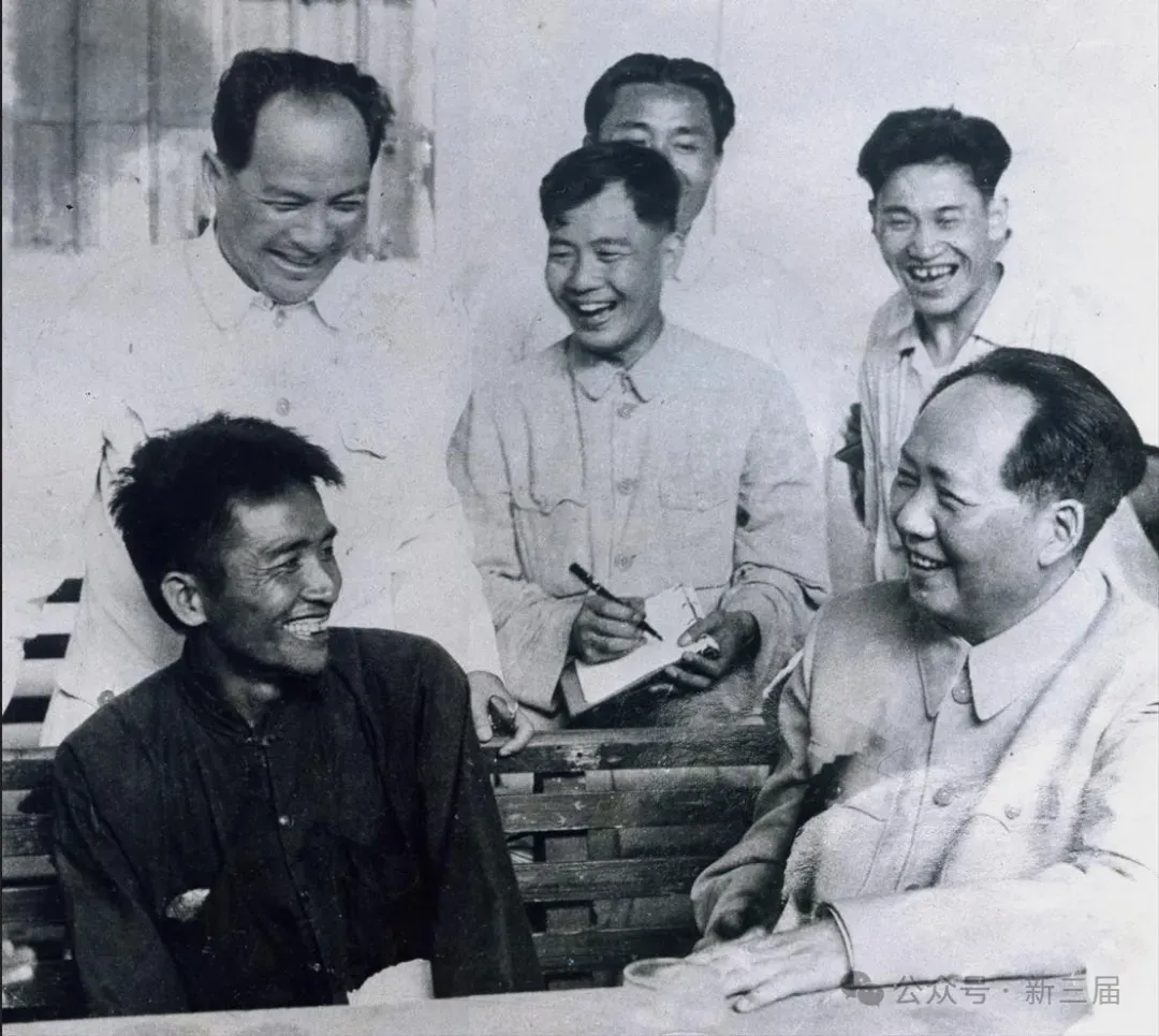 1958年4月30日毛泽东视察广州棠下村。新华社广东分社副社长许实(2排中)在采访中