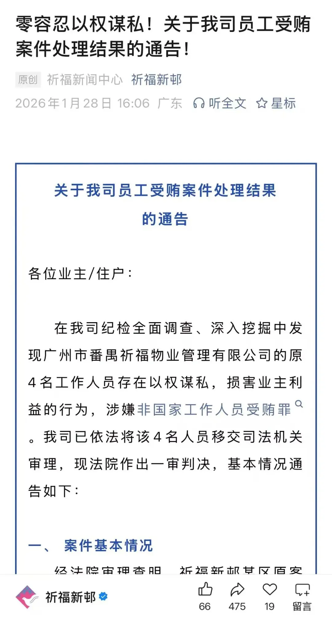 2026年1月28日,广州市番禺祈福物业管理有限公司发布通告,通报4名员工受贿案件处理结果。该4名员工(曹某某、周某某、简某某、谭某某)利用装修巡查职务便利,收受装修承包人好处费,为违规装修提供方便,涉嫌非国家工作人员受贿罪,已被法院一审判处有期徒刑(适用缓刑),追缴违法所得并处罚金,公司已与其解除劳动关系,相关行贿人也被追究刑责。