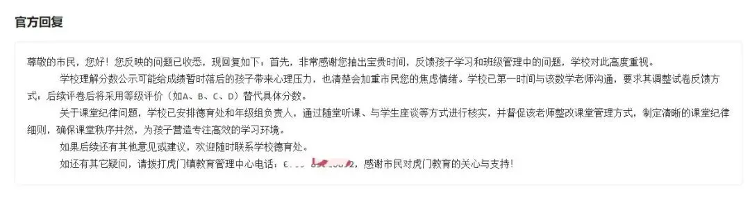 学校理解分数公示可能给成绩暂时落后的孩子带来心理压力,也清楚会加重市民您的焦虑情绪。学校已第一时间与该数学老师沟通,要求其调整试卷反馈方式:后续评卷后将采用等级评价(如A、B、C、D)替代具体分数。