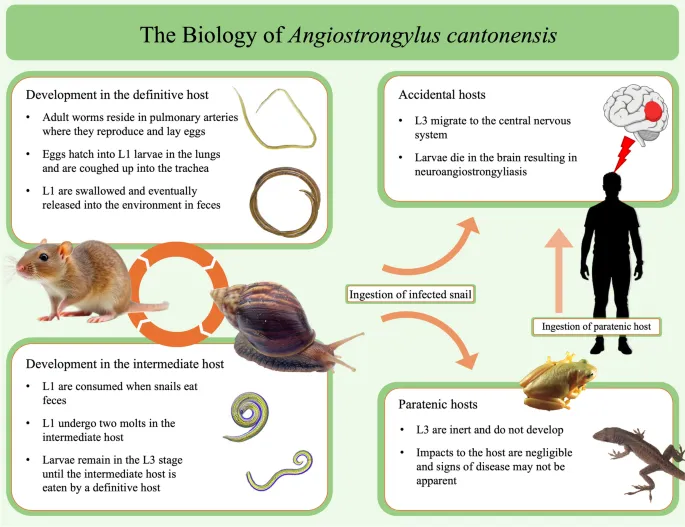 ▲上图:广州管圆线虫病的生活史。图源:Griffin, C. D., Ezenwa, V. O., & Cowie, R. H. (2025)