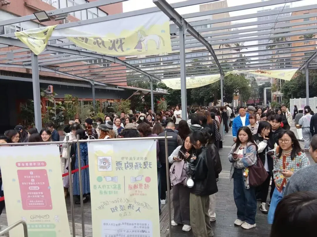 华侨城创意园常年有市集,很多的爱好者也在这里见过不少大场面,但「过森日·全国女子美学节」深圳站的开幕,还是被这盛况震撼到失语——市集展区门口蜿蜒数百米的长队,满是欢声笑语,这个以热爱为名的充满青春活力的队伍里也有带着毛孩子的年轻人、推着婴儿车的亲子家庭,还有举着相机打卡的博主,大家冒着毛毛细雨排队,只为奔赴这场以女性热爱为底色的美学盛宴。