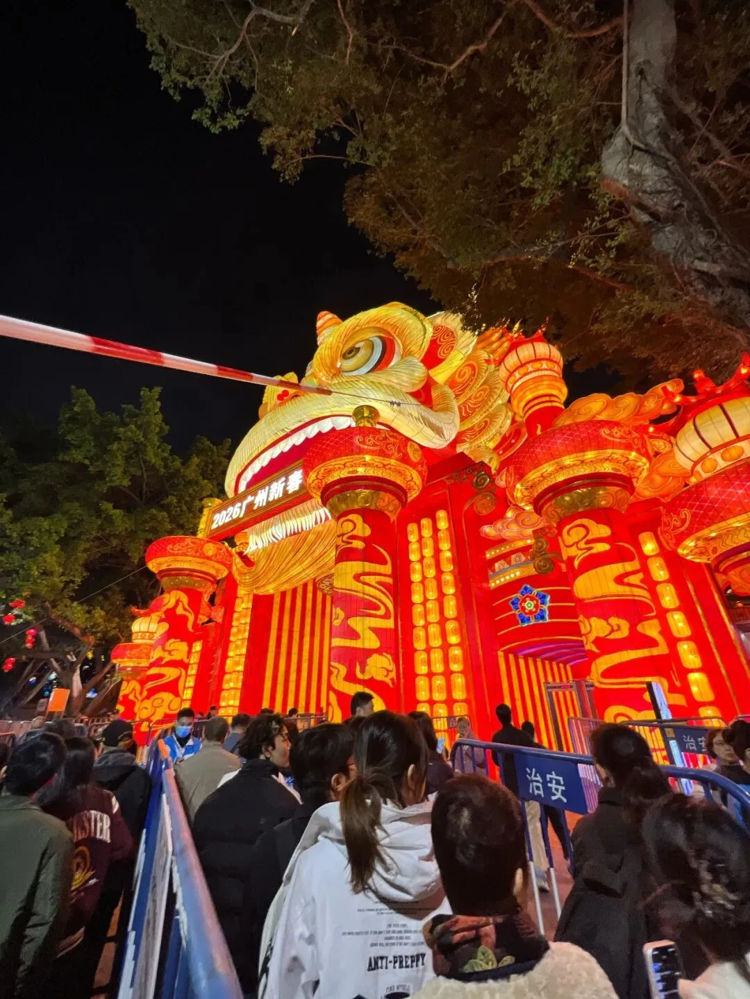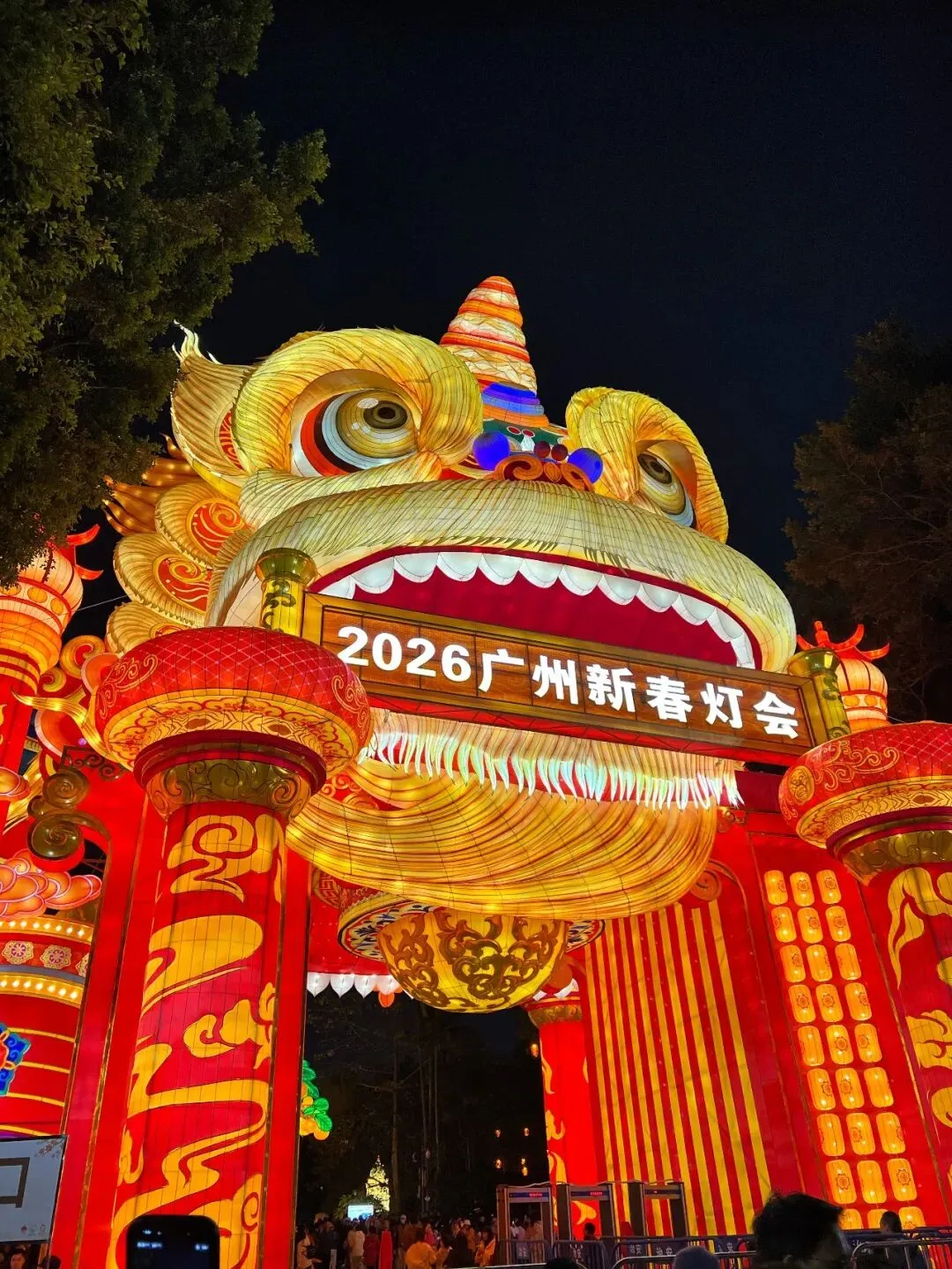 谁懂啊!刚到越秀公园门口,就被这只巨型醒狮花灯拱门帅到失语!作为本次灯会的“门面担当”,红黄撞色自带年味buff,鬃毛纹理精致到发丝,远远望去气场全开,拍照巨出片!