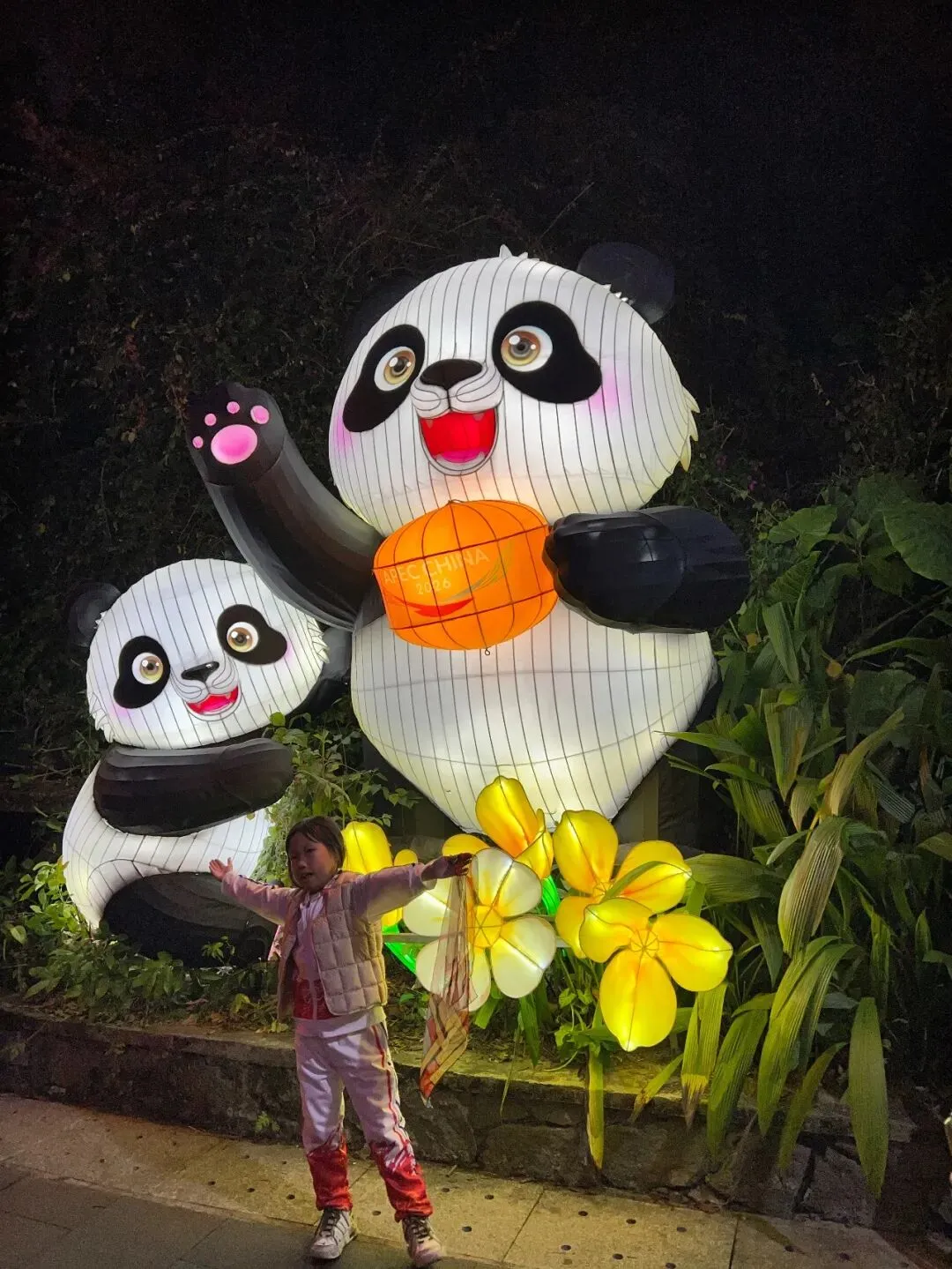 穿过醒狮拱门,没走两步就被熊猫花灯拦住去路——这波可爱暴击谁顶得住!超大只熊猫端坐一旁,举着“TAIPEI CHINA 2026”的灯笼,憨态可掬;小熊猫扒在旁边晃爪子,粉扑扑的脸蛋配闪灯,软萌值超标!
