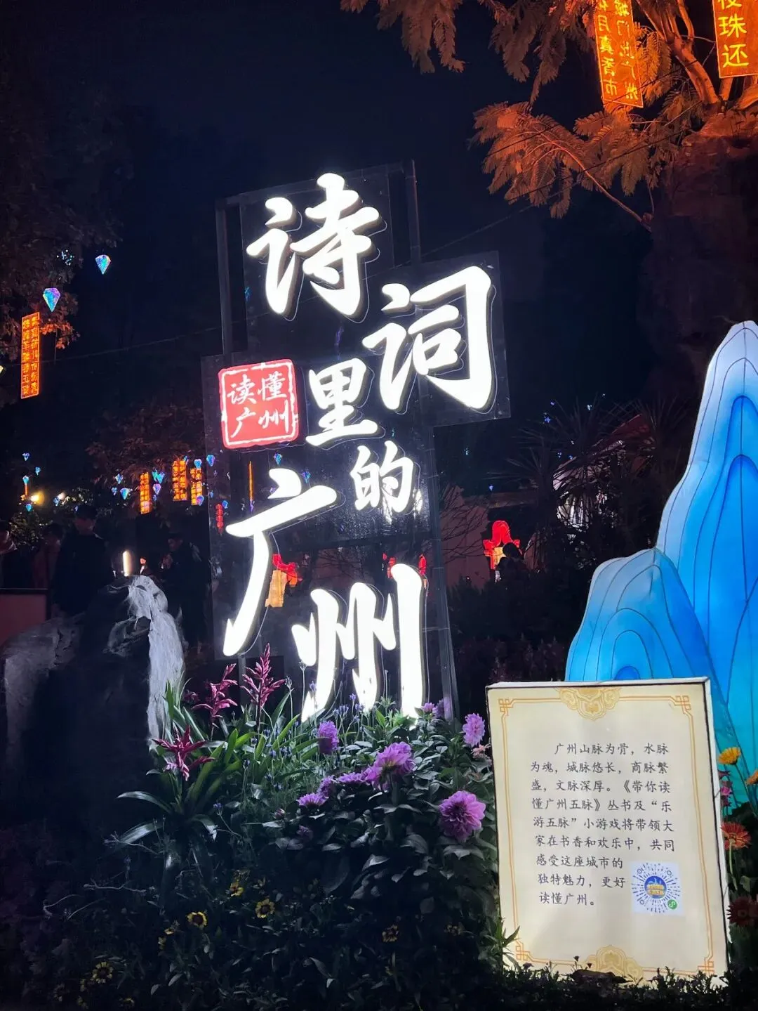 顺着小路往前走,头顶的风景越看越惊艳!树枝间挂满竹编暖黄灯,柔光裹着紫花,把春日温柔揉进夜色里。更惊喜的是路边的“诗词里的广州”发光装置,搭配“读懂广州”标识,文化感直接拉满,拍照自带氛围感滤镜。