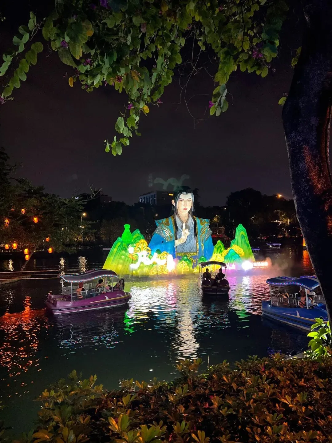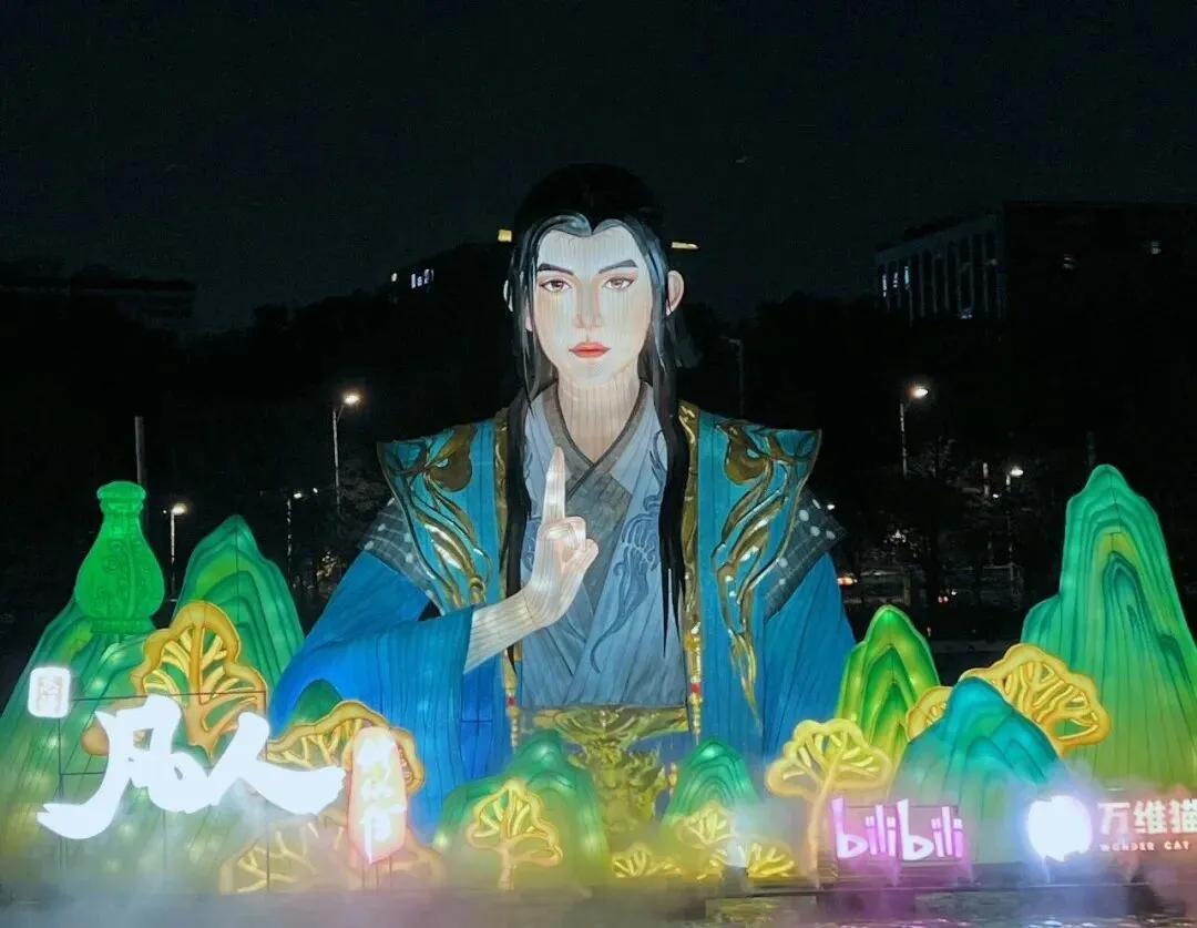 走到湖边才发现,这里藏着本次灯会的王炸亮点!水面上的巨型人物+青绿山水花灯,把中式美学焊在夜色里,山峦叠嶂、人物舒展,仿佛从古画里走出来的场景。更绝的是,湖水里居然藏着《凡人修仙传》韩立主题灯展,修仙迷直接DNA动了!