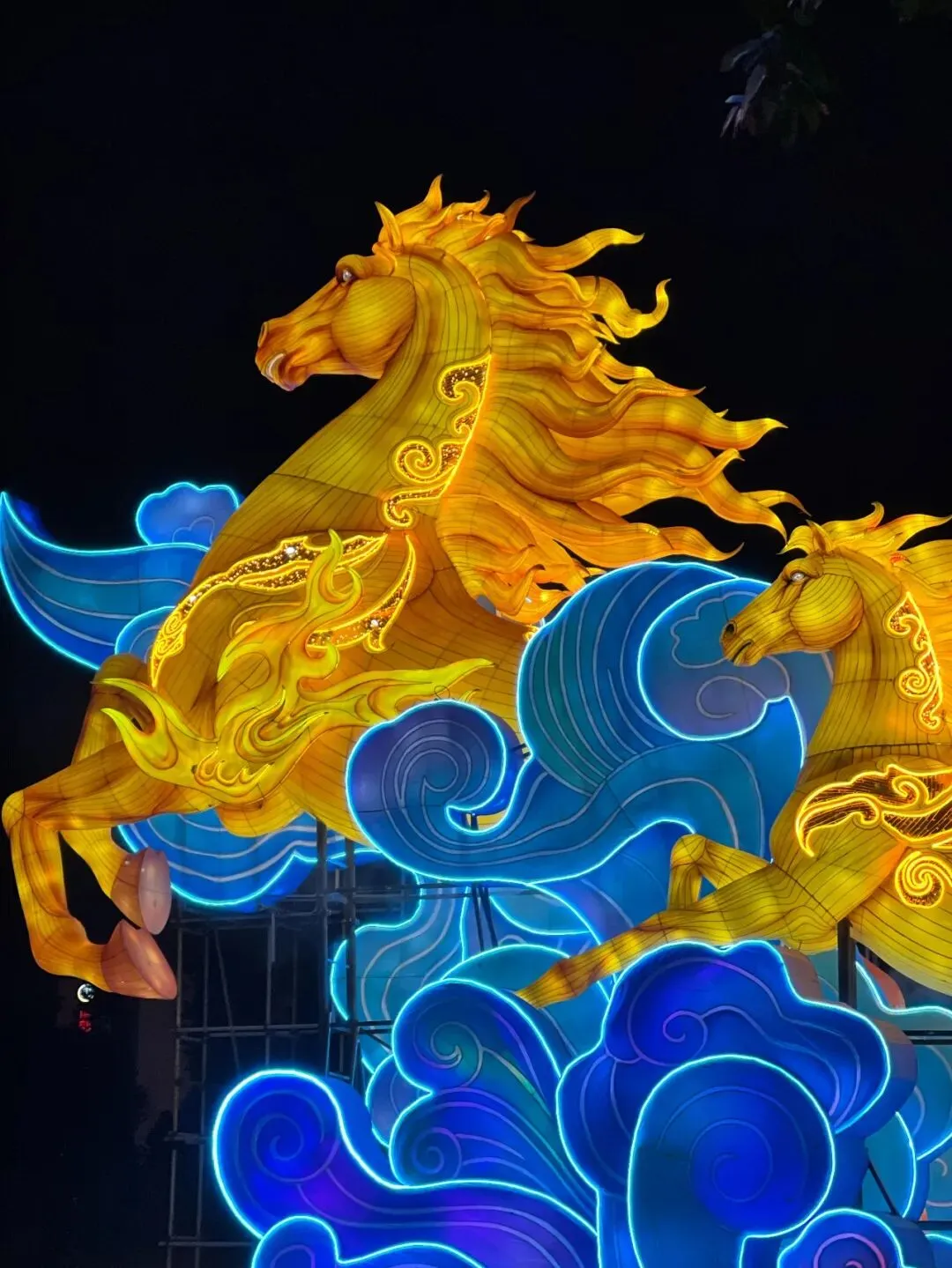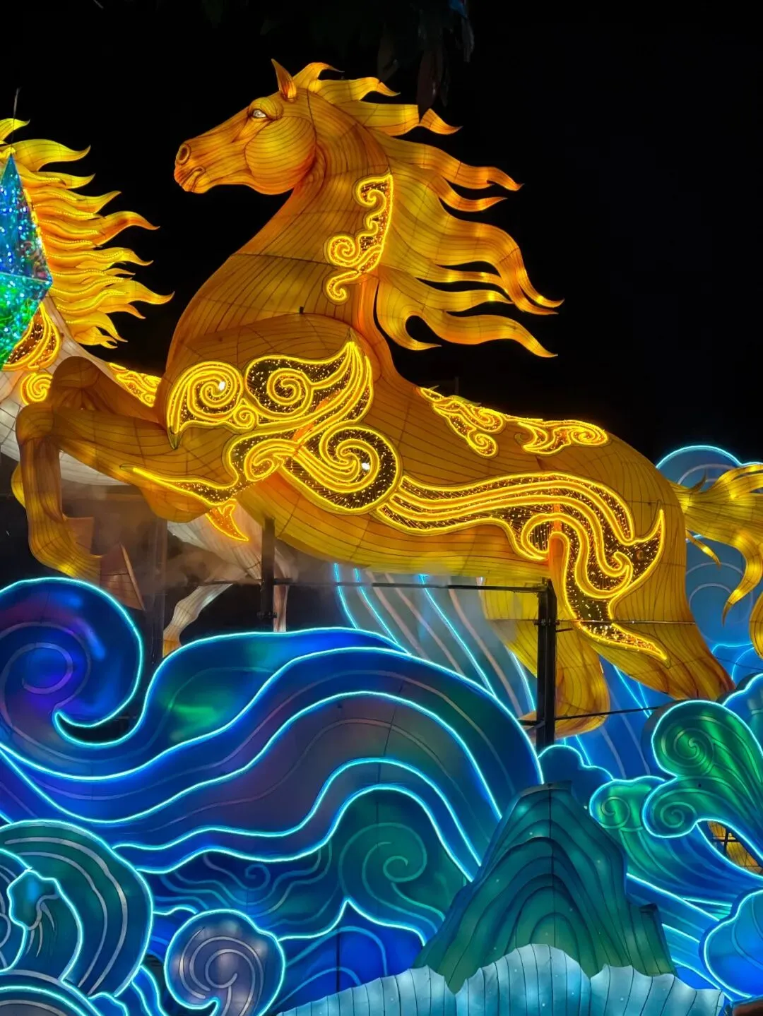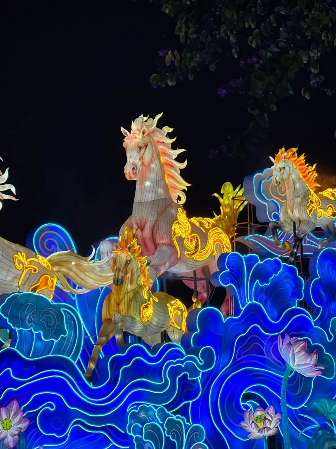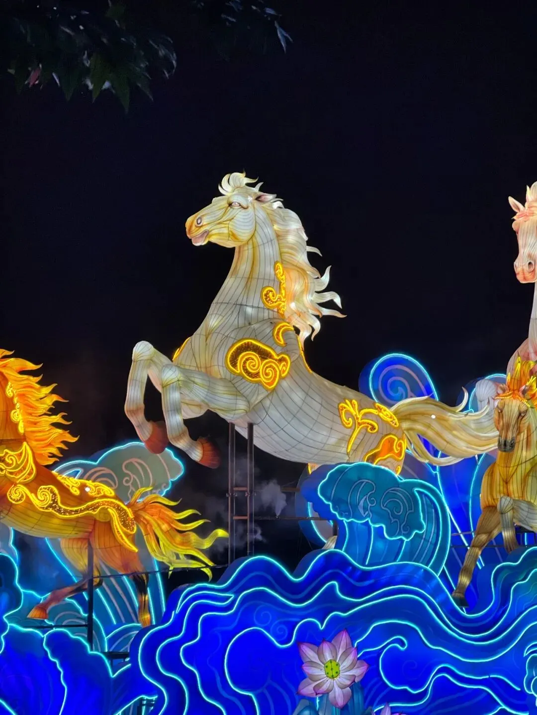 不远处的“八骏”主题花灯也超吸睛!金黄骏马栩栩如生,鬃毛舒展、身姿矫健,踩着蓝绿浪纹与粉荷,自带奔腾气场。金黄灯光搭配蓝绿浪纹,色彩碰撞又和谐,中式美学感直接拉满。