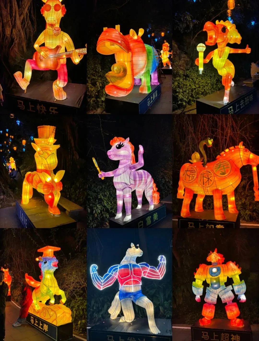 继续往前走,就到了潮马祈福道,9款创意马花灯承包马年所有好运!和传统骏马不一样,这里的马儿个个有个性——弹吉他的摇滚马、拿话筒的主唱马、变超人的酷飒马,俏皮感拉满!
