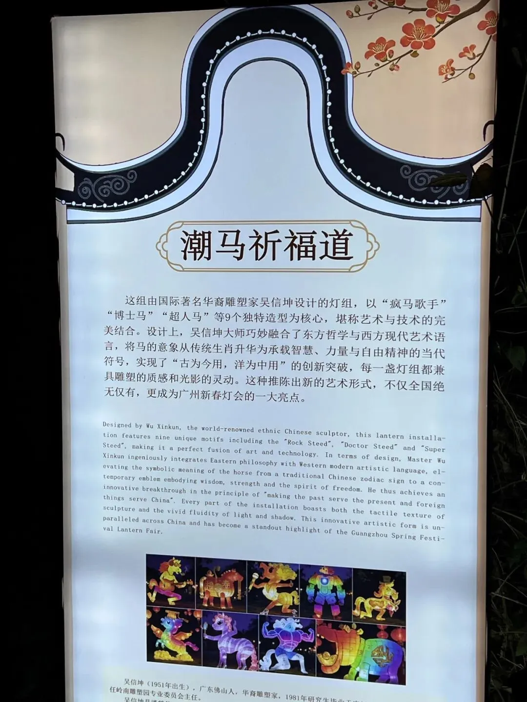 看说明牌才知道,这些花灯是吴信坤打造的东西方艺术融合款,传统骏马元素+现代潮流设计,既有中式韵味又有时尚感,妥妥的灯会独家亮点,拍照打卡超有纪念意义!