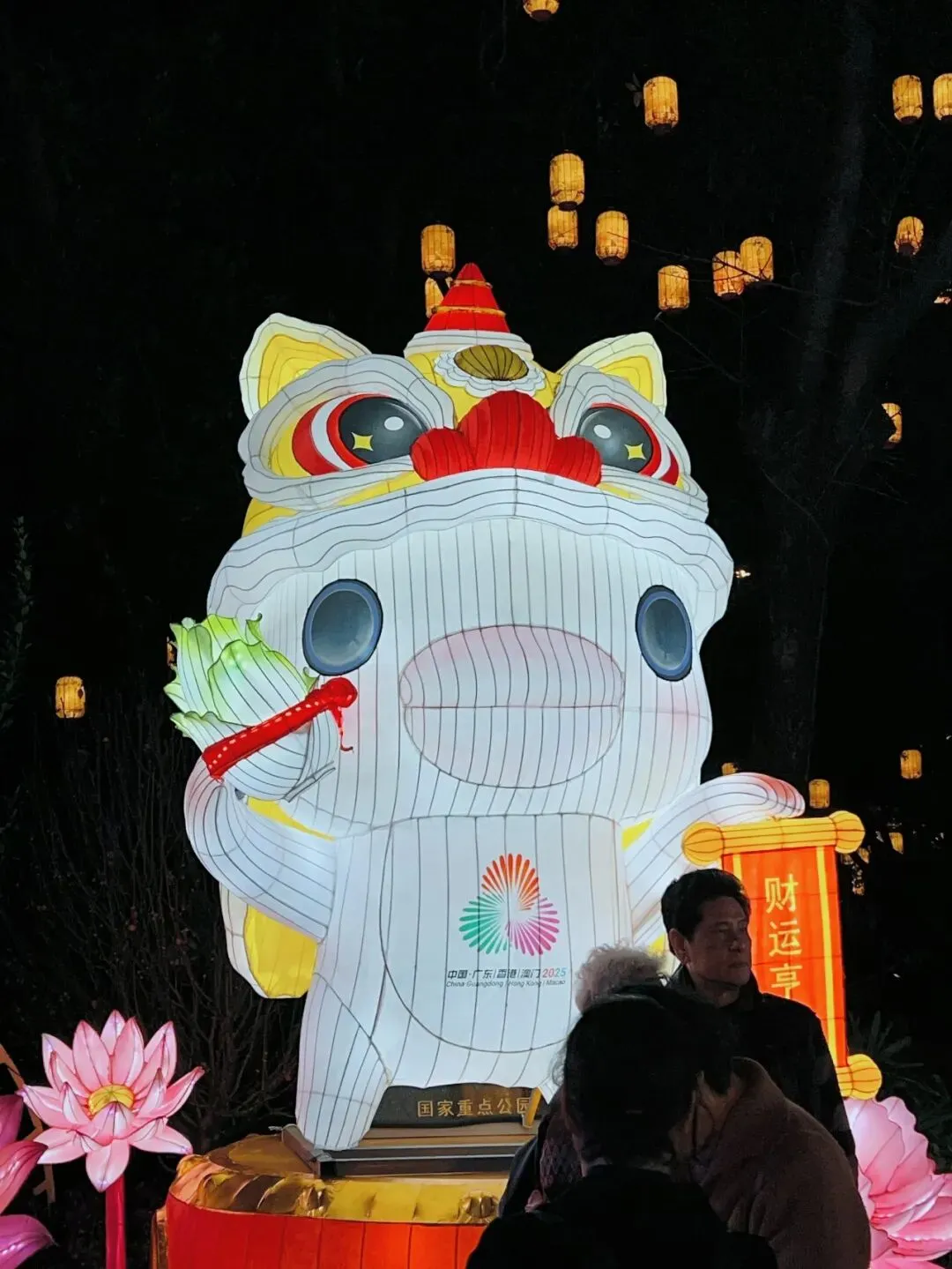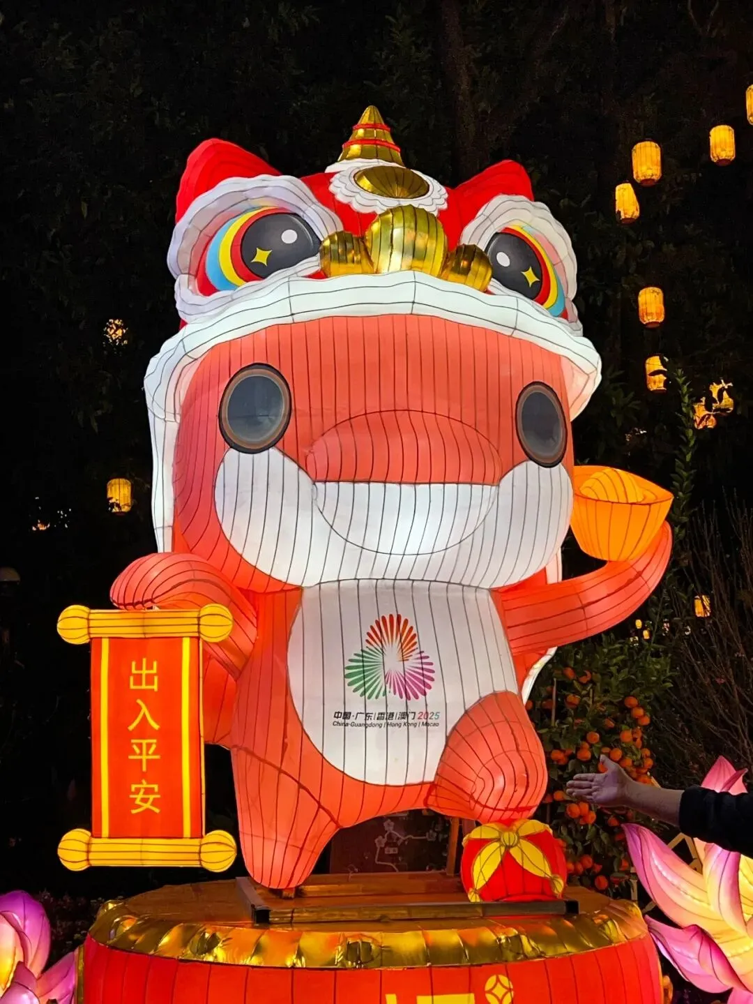 逛到中途偶遇两只萌狮花灯,福气直接拉满!白色萌狮顶着醒狮头,抱着生菜(寓意生财),身上还有2025广州园博会标识,主打一个财源广进;红色萌狮捧着金元宝,搭配“出入平安”卷轴,旁边橘子树挂满果实,喜庆感直接拉满!