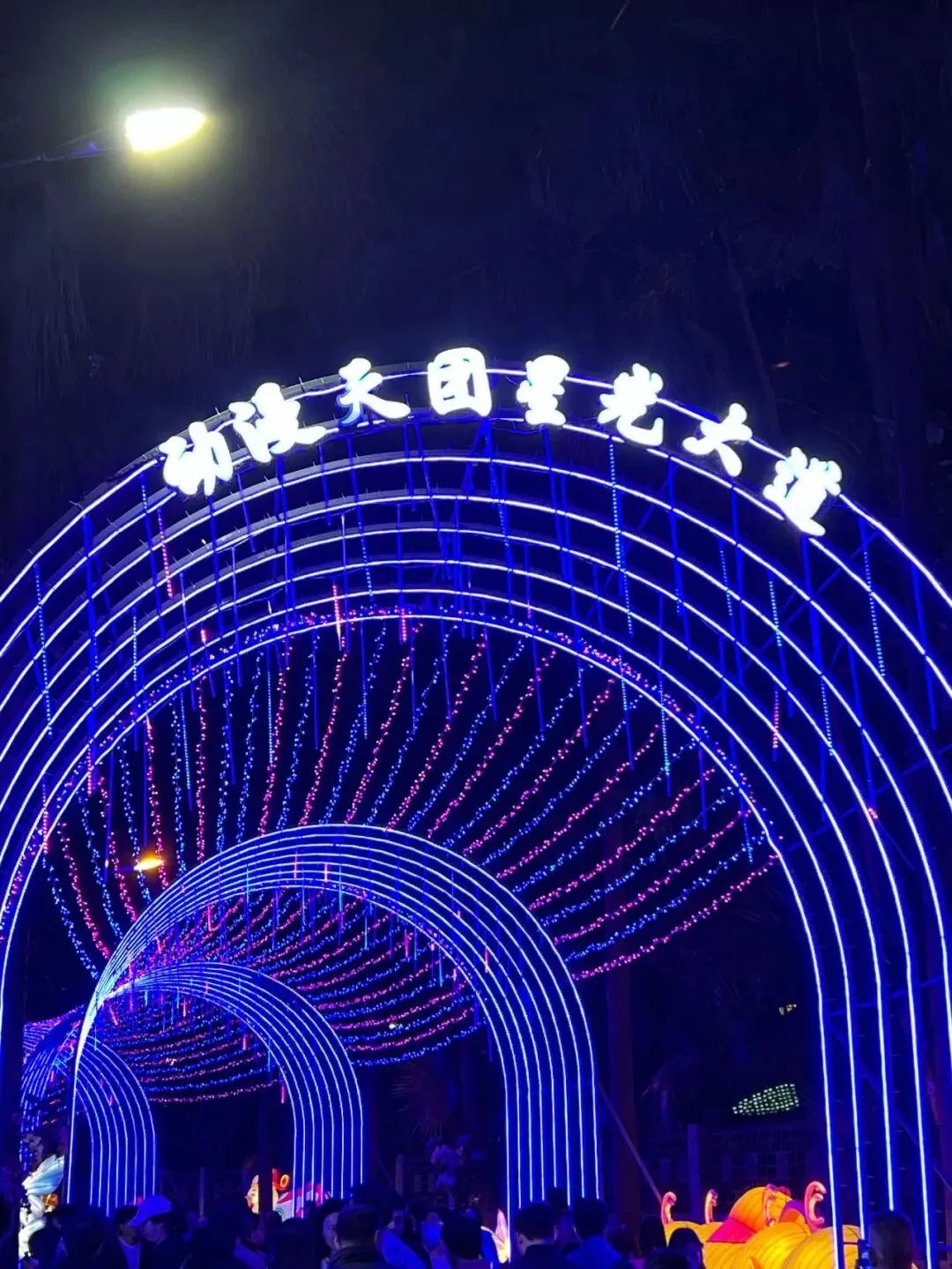 游玩的最后,一定要冲“动漫画园星光大道”!蓝紫色多层拱形灯光通道,氛围感直接拉满,门头字样醒目,灯光流转间秒闯二次元童话世界。这里挤满打卡的人,顺着通道往前走,每一步都充满仪式感,沉浸式收尾超治愈。