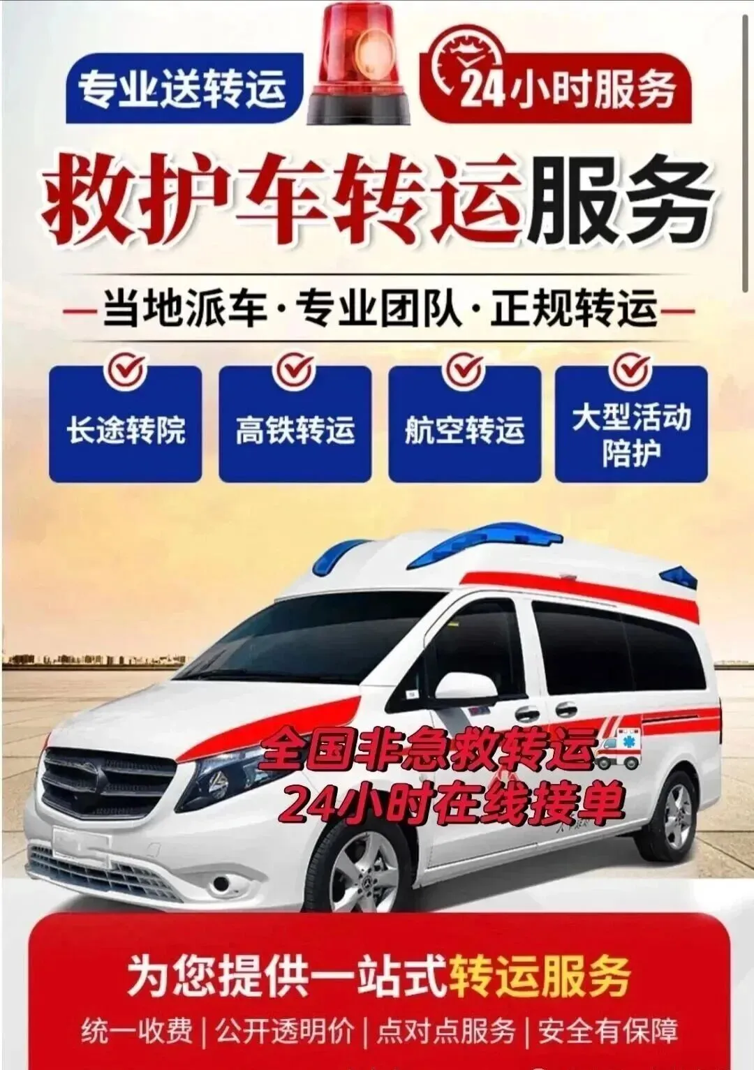 专业救护车出租转运,刚好填补了传统急救车的服务空白,就像移动的生命守护者,用专业又高效的服务,帮大家解决各类异地医疗转运的难题,安心守护每一位患者的健康。